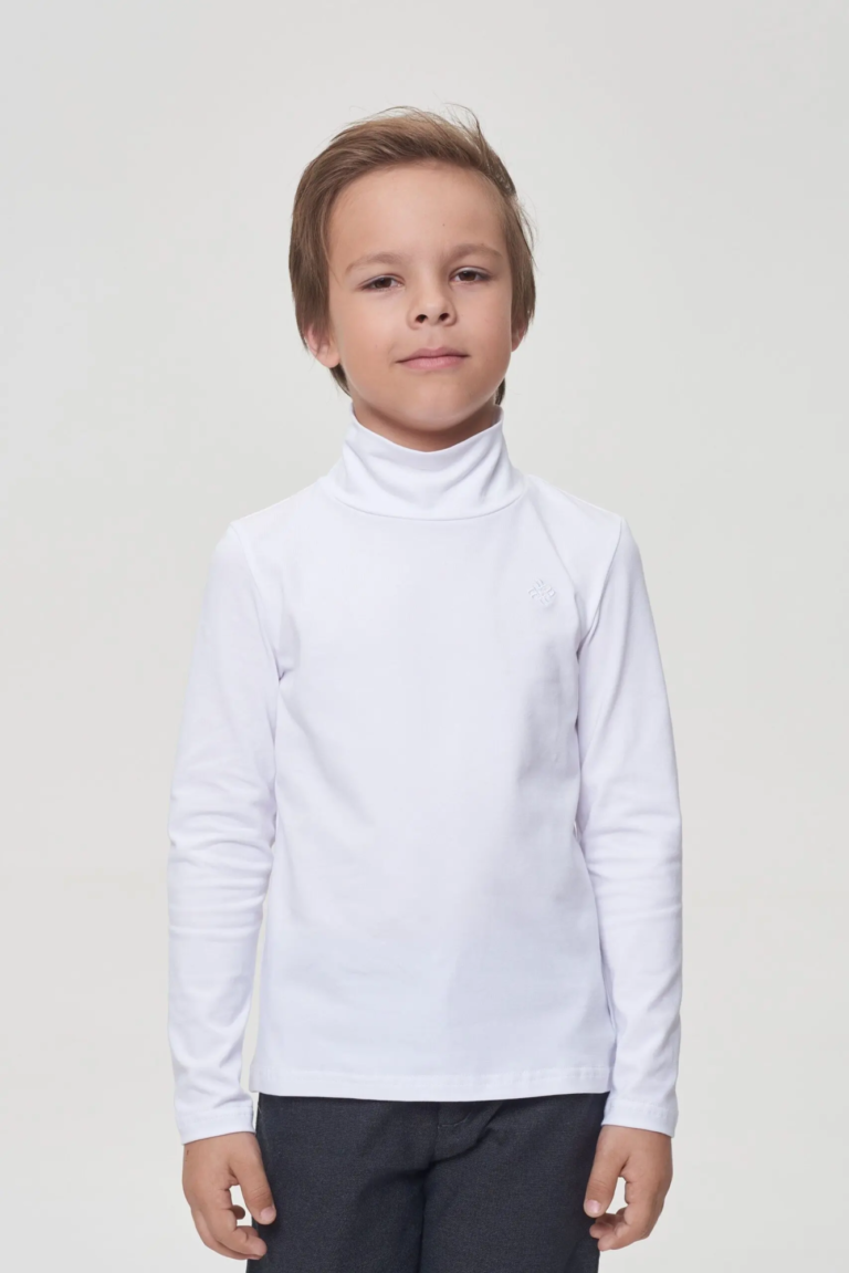 Базовая водолазка для мальчика изготовлена из натуральной и приятной к телу ткани. Так что ребенку обеспечен максимальный комфорт. Качественный материал не растягивается после стирки, сохраняет форму. ... Белый цвет позволяет сделать водолазку частью любого образа.