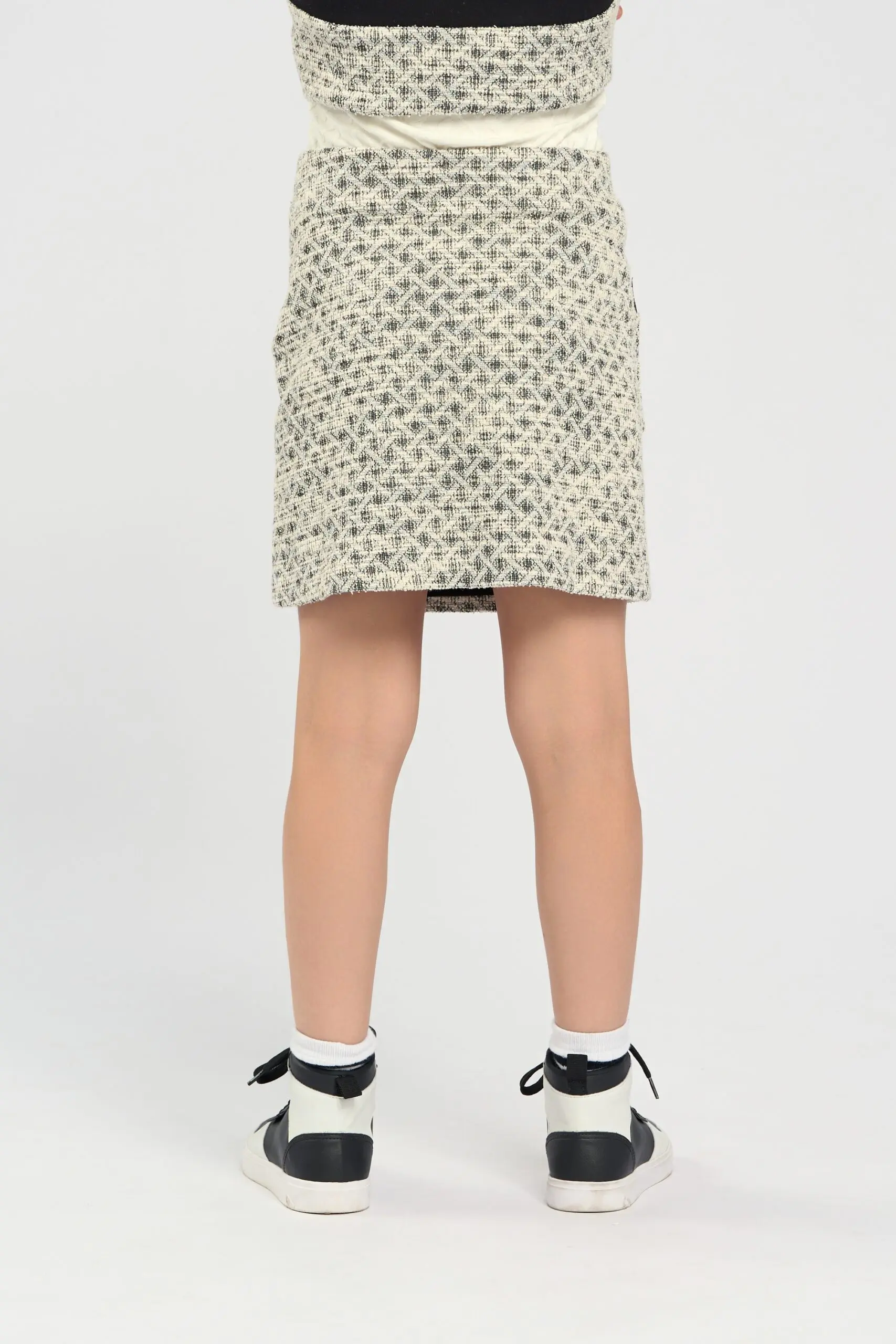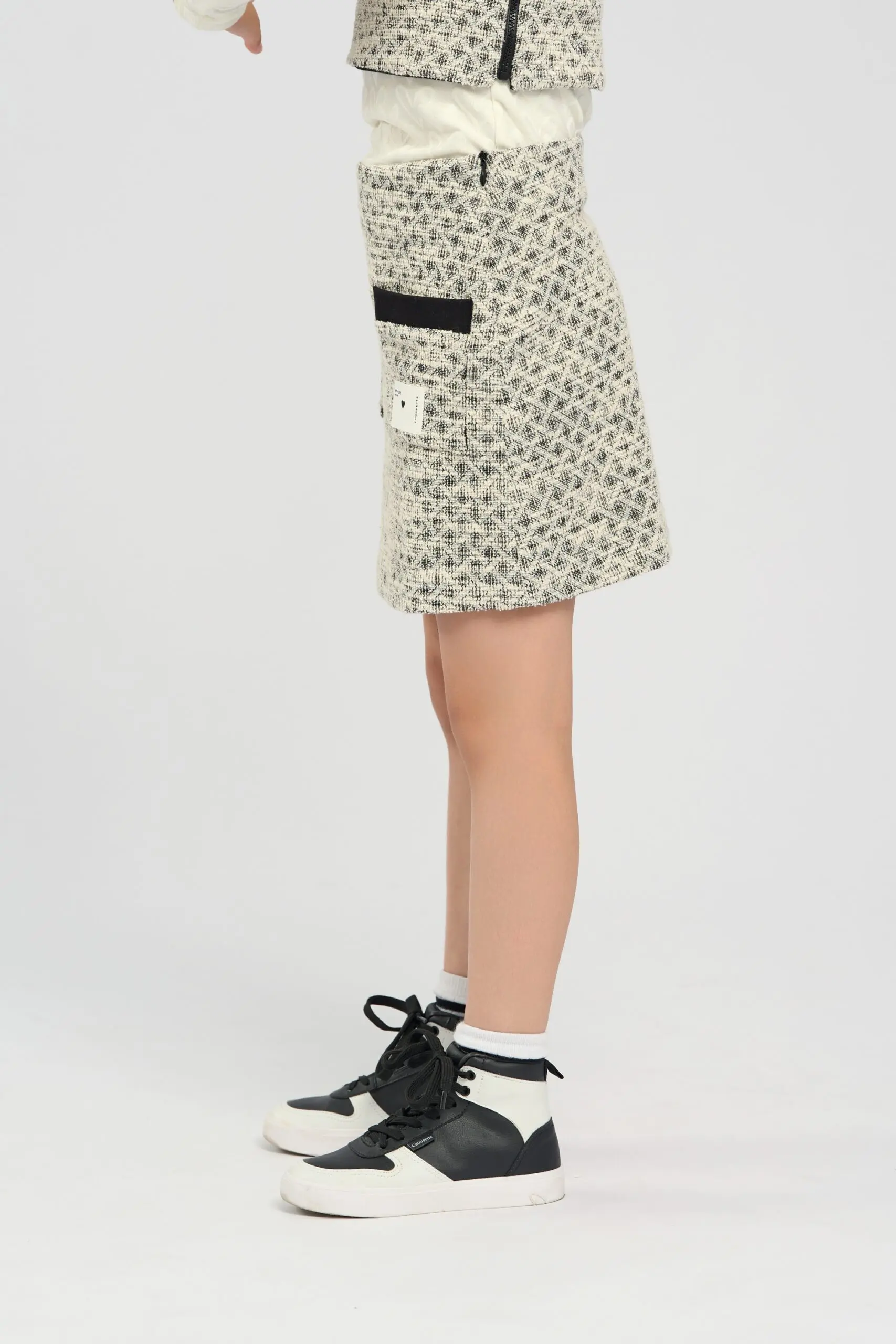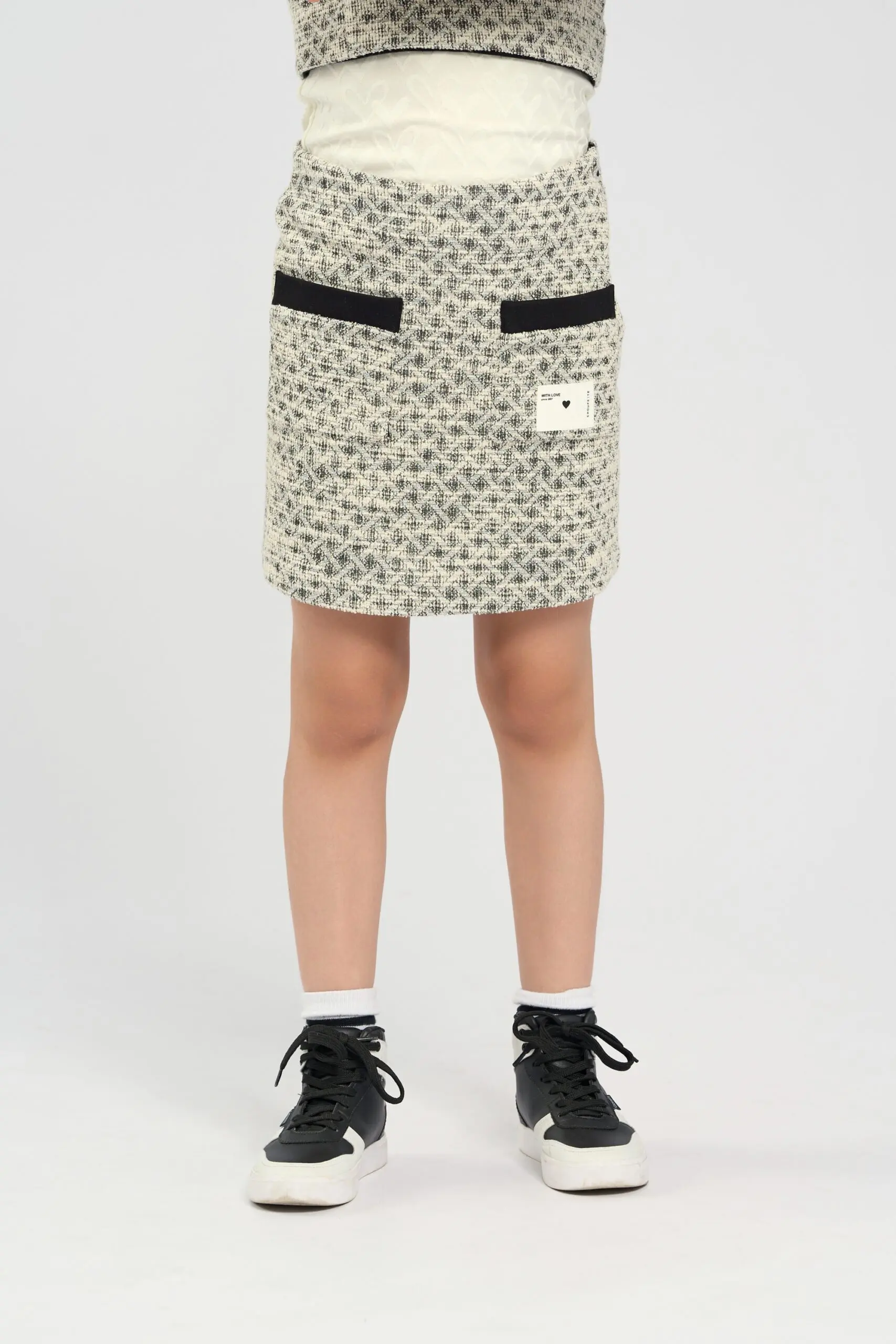 Юбка из трикотажа джерси черно-серого оттенка для девочки имеет стильный классический дизайн. Трикотаж джерси обеспечивает мягкость и эластичность, что делает юбку удобной для повседневной носки. Прямой ... крой придает изделию лаконичную и универсальную форму, подходящую для различных случаев. Особый акцент на юбке создают накладные карманы, украшенные декоративными пуговицами с изображением оригинальных сердечек. Изделие имеет подкладку из хлопка.