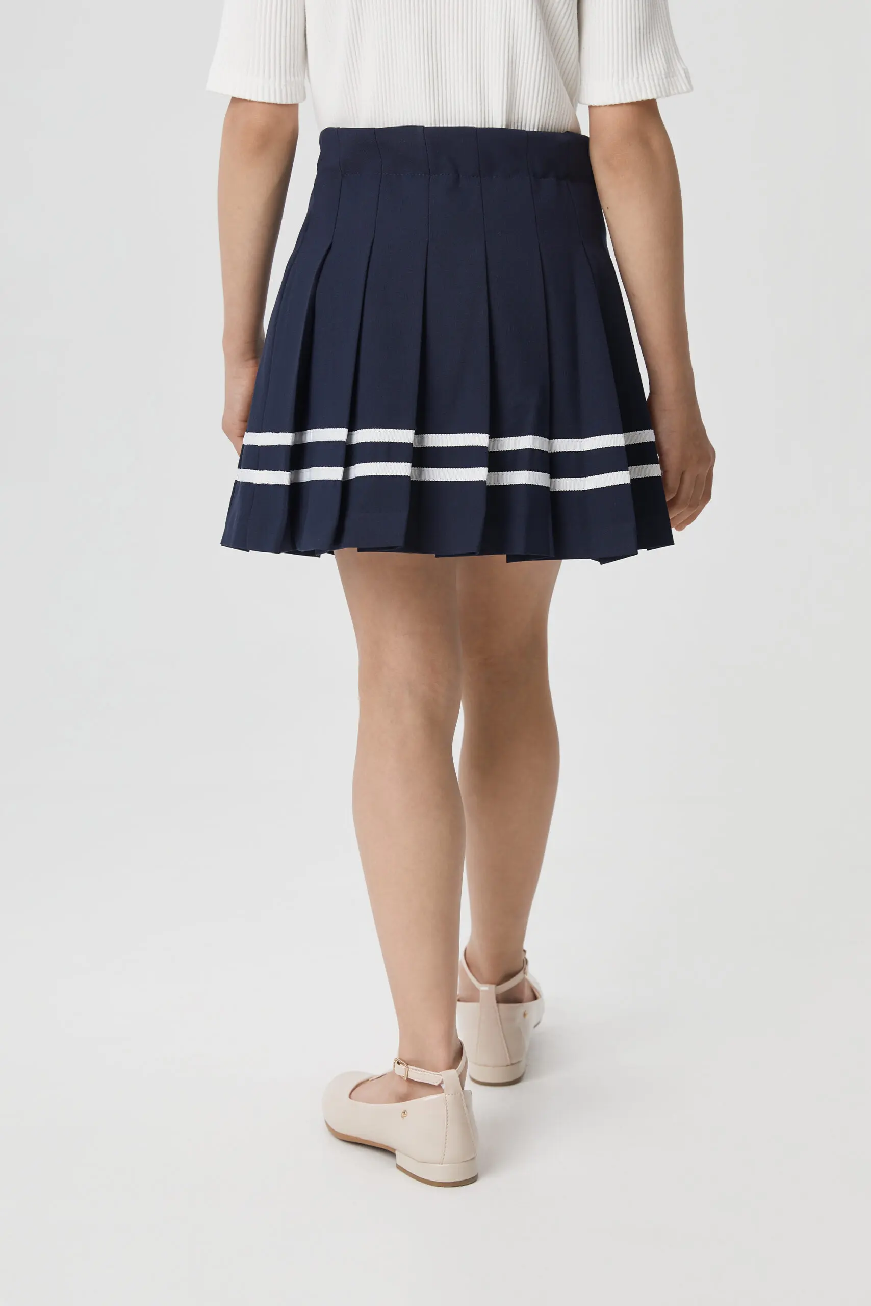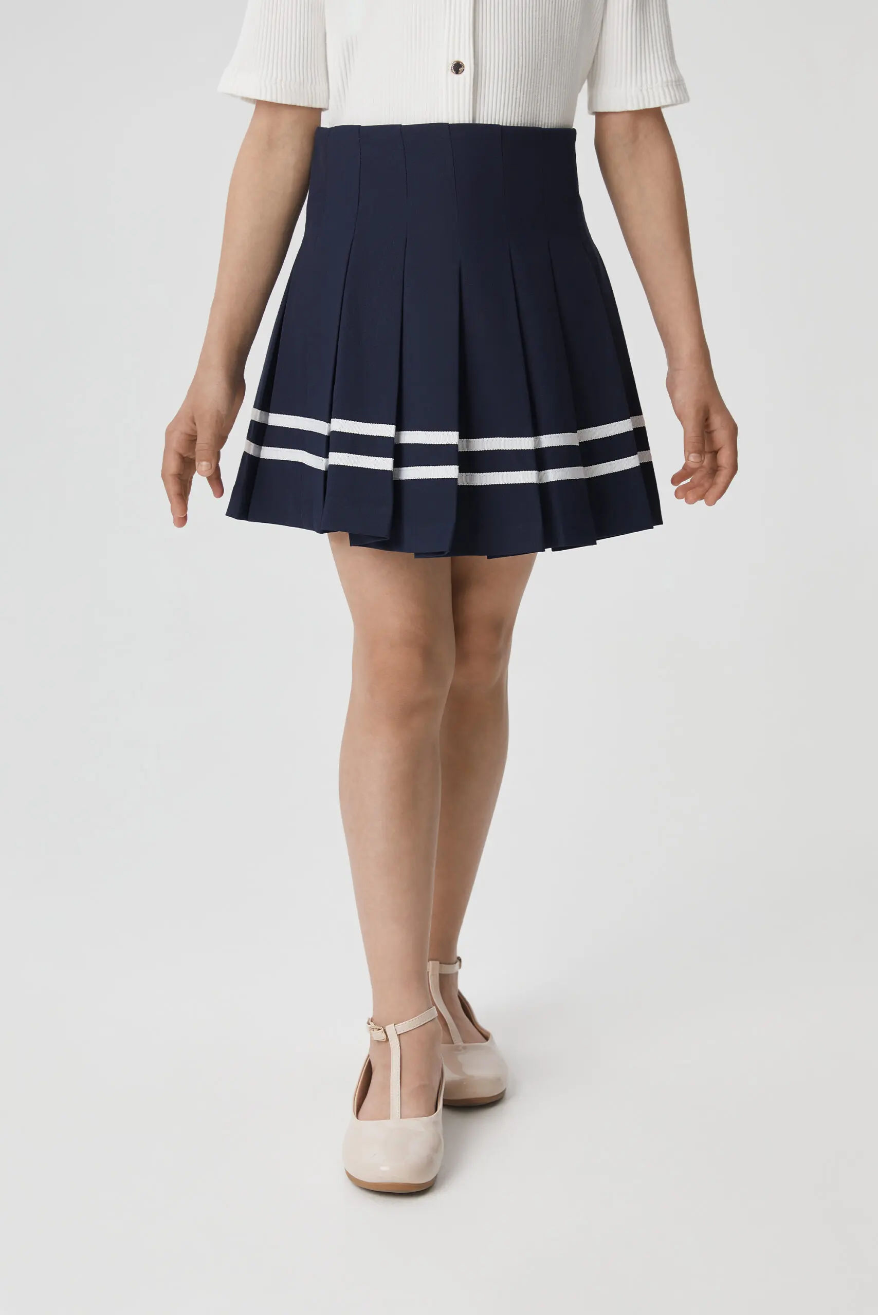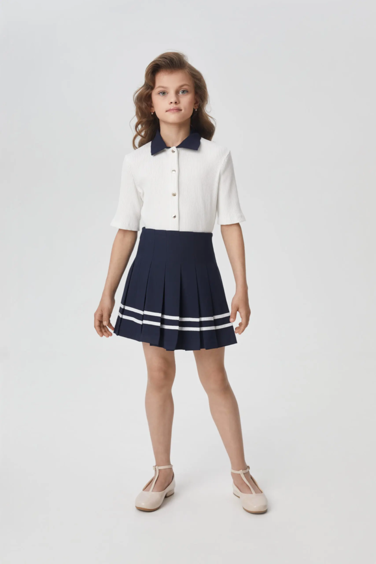 Юбка из костюмной ткани насыщенного синего цвета гармонично дополнит школьный гардероб. Модель трапециевидного силуэта со складками, которые подчеркивают контрастные белые полосы.