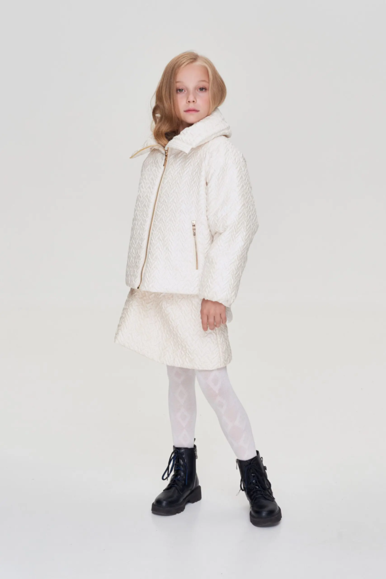 Трудно представить себе гардероб начинающей модницы без такого предмета как юбка. Часто юные принцессы предпочитают пышные модели с оборками и рюшами. Но наряды А-силуэта тоже популярны. ... Стильная юбка для девочки выполнена из красивой плащевой ткани нежного сливочного оттенка. Свободный силуэт, пояс на резинке, удобная застежка-молния. В комбинации с джемперами, футболками и куртками в тон получится элегантный и модный аутфит.