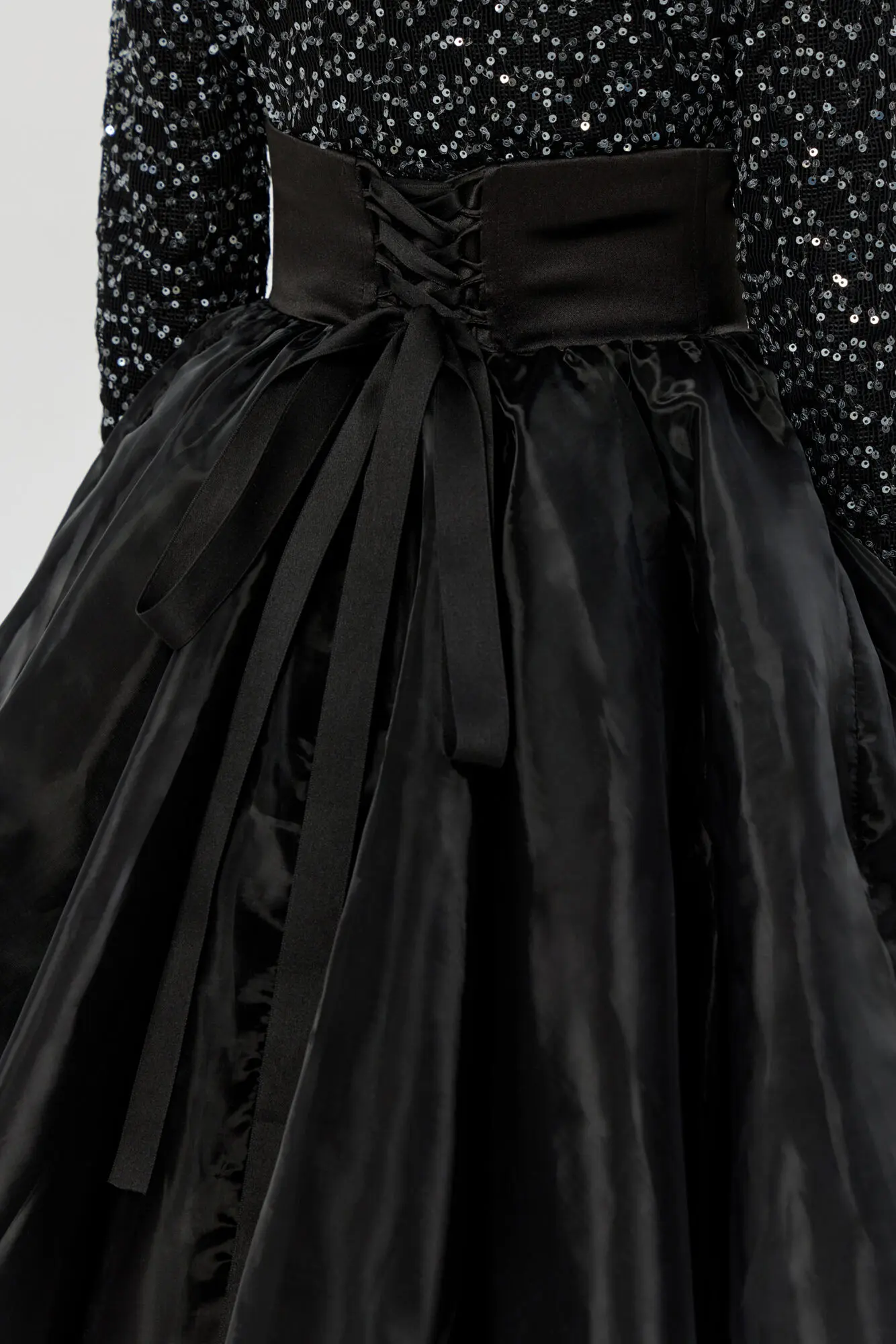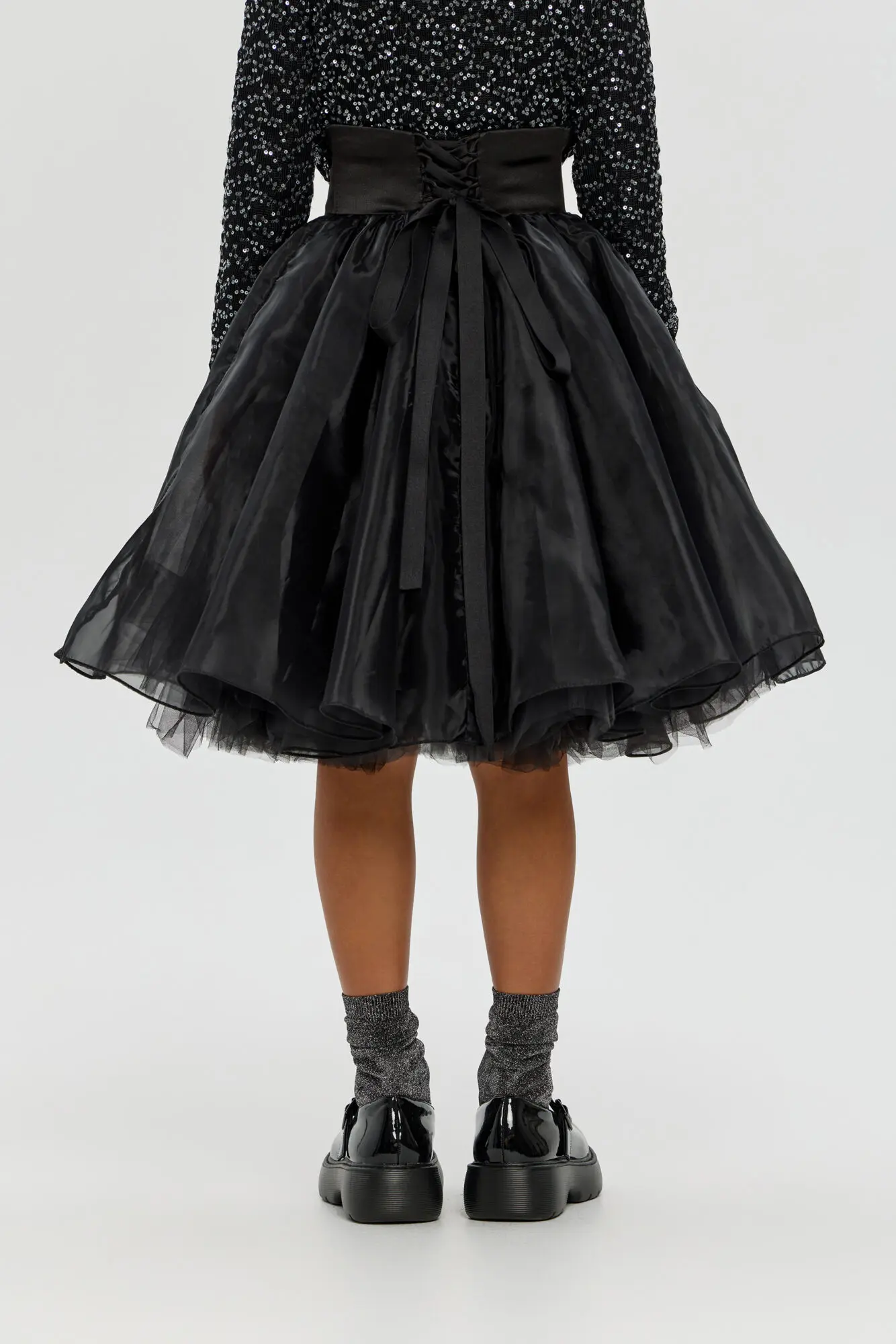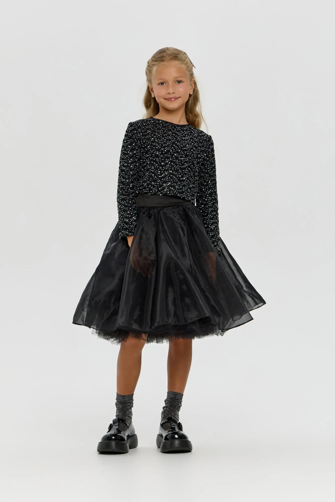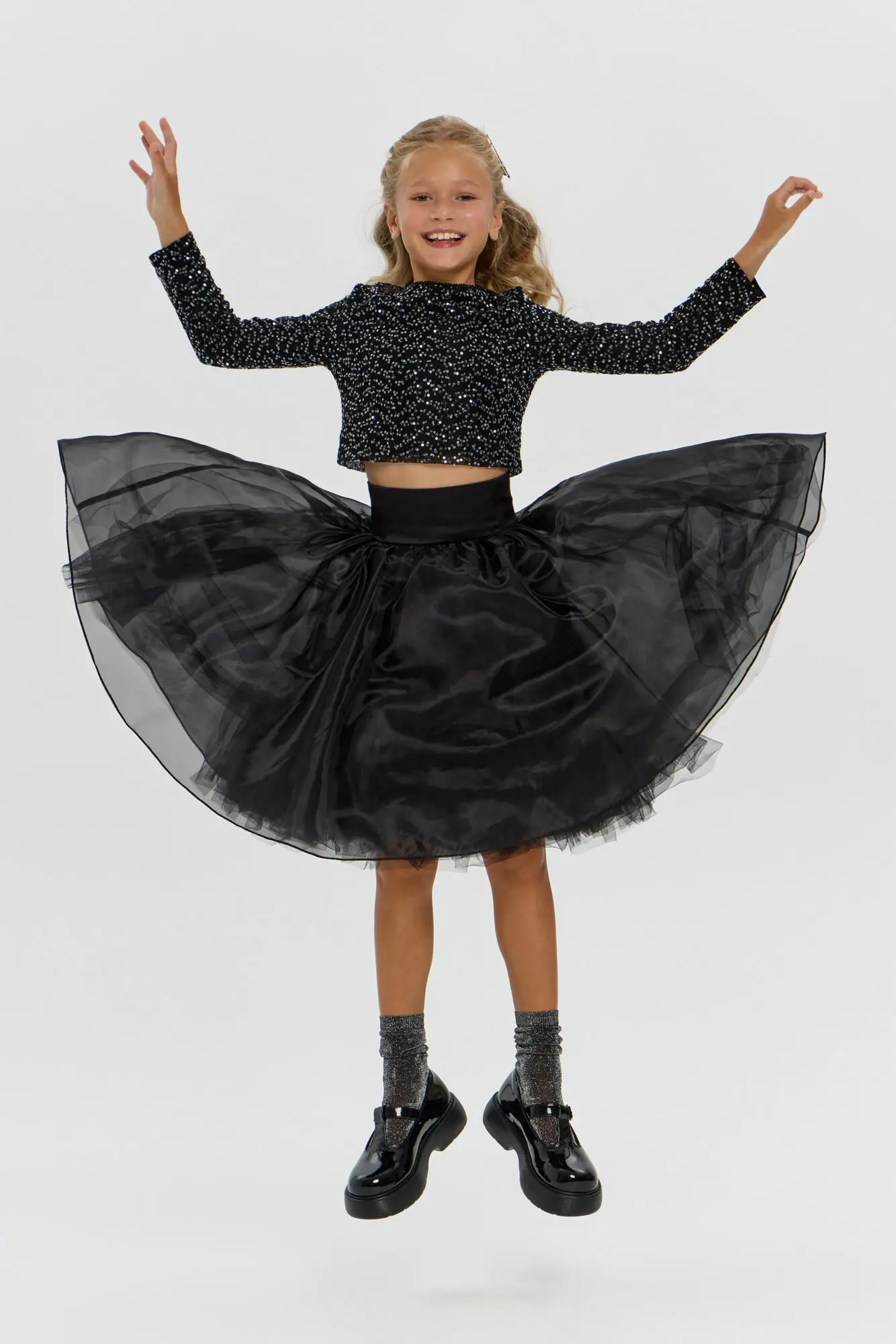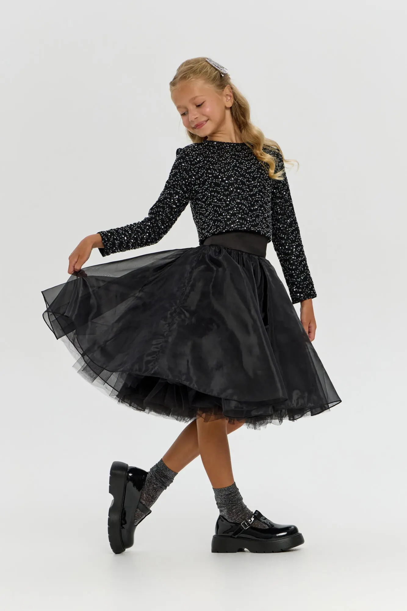 Пышная юбка в черном цвете — это эффектный элемент гардероба девочки. Модель идеально подходит для торжественных событий, например, для утренников или дней рождения. Широкий эластичный пояс ... обеспечивает комфортную и удобную посадку, облегчая процесс переодевания. Нижняя юбка создает дополнительный объем, формируя кокетливый и нежный образ. Юбка легко комбинируется с различными видами верха, будь то блузки или топы.