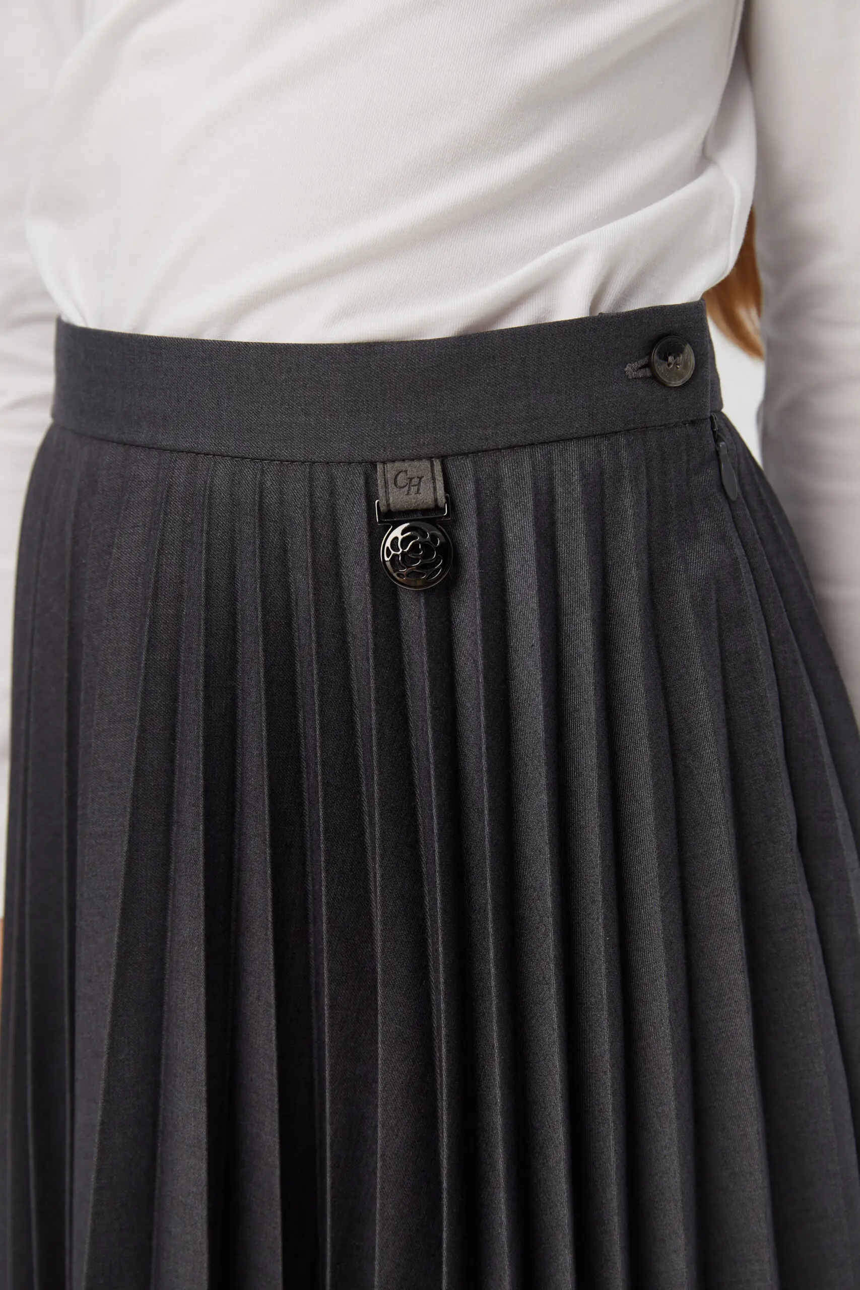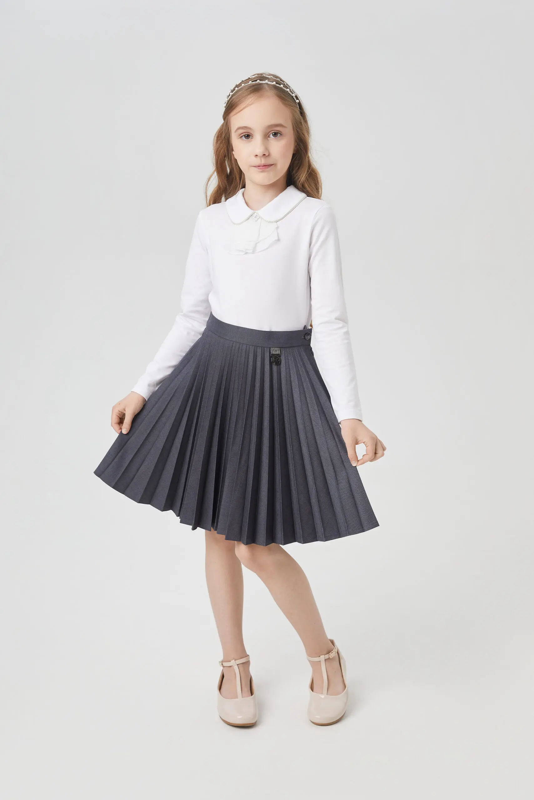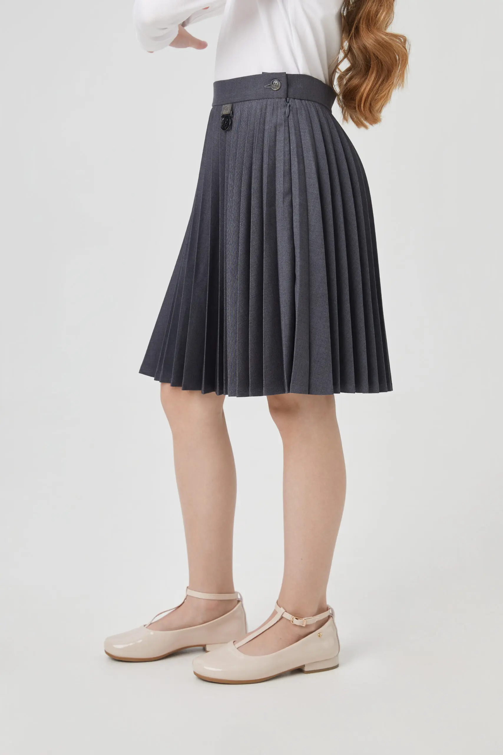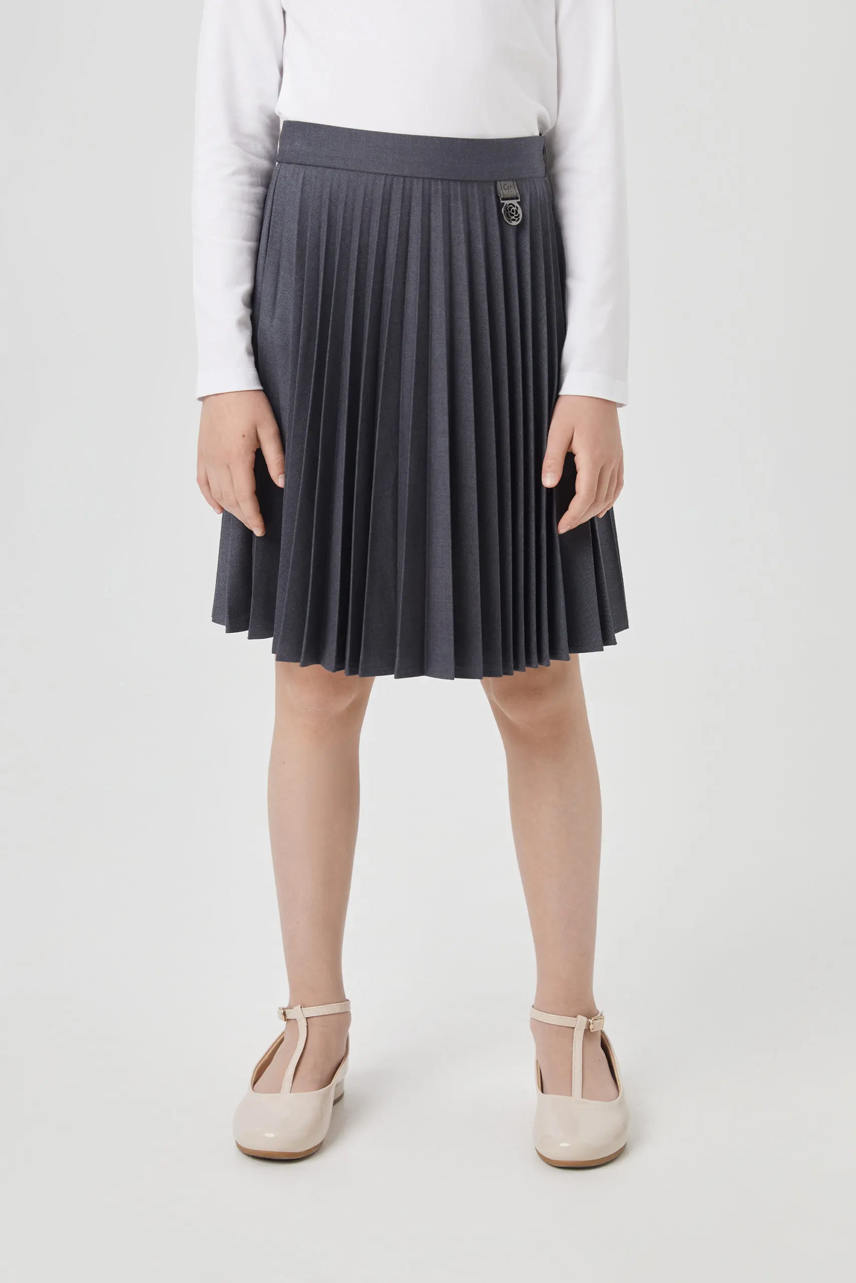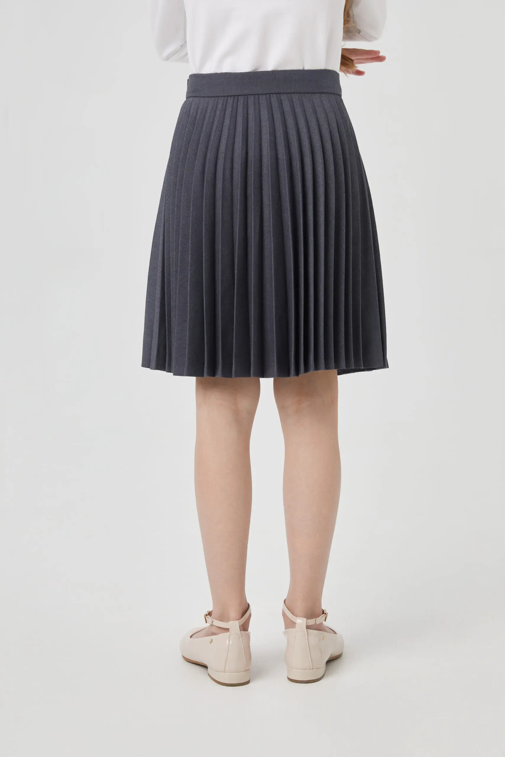 Приятный оттенок серого юбки плиссе до колена станет хорошим фоном для составления интересных комплектов для школьных будней или прогулки.