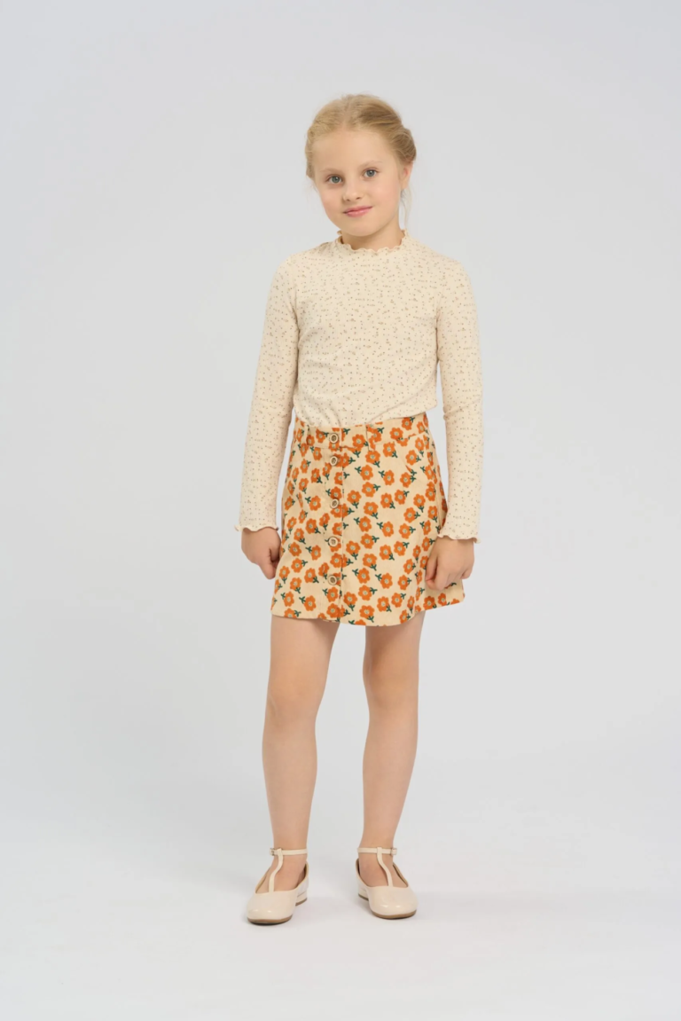 Юбка из микровельвета бежевого цвета украшена милым цветочным рисунком. Модель комфортной длины имеет трапециевидную форму. Для удобной посадки на поясе сзади предусмотрена эластичная вставка. Юбка с ... активным принтом гармонично дополнит любой однотонный верх. Благодаря качественной смесовой ткани модель хорошо держит форму и не мнется, что важно для активных детей. Застегивается юбка на пуговицы.