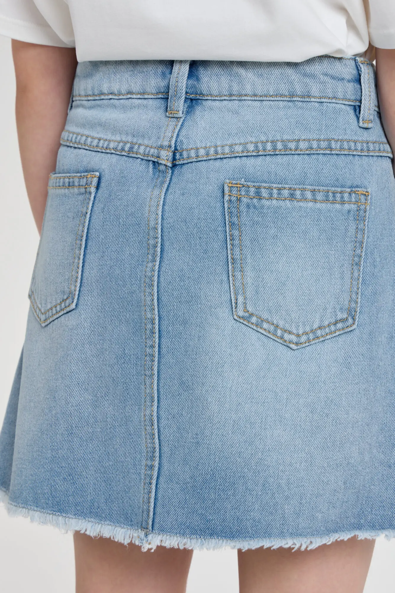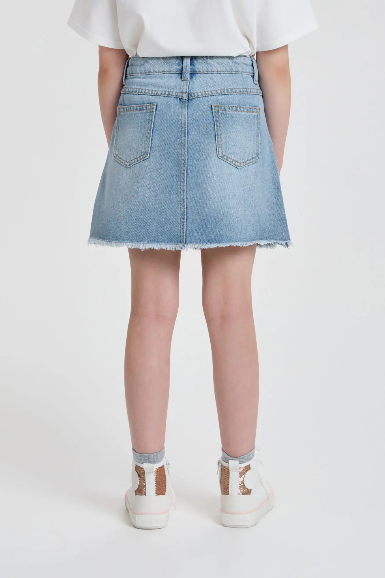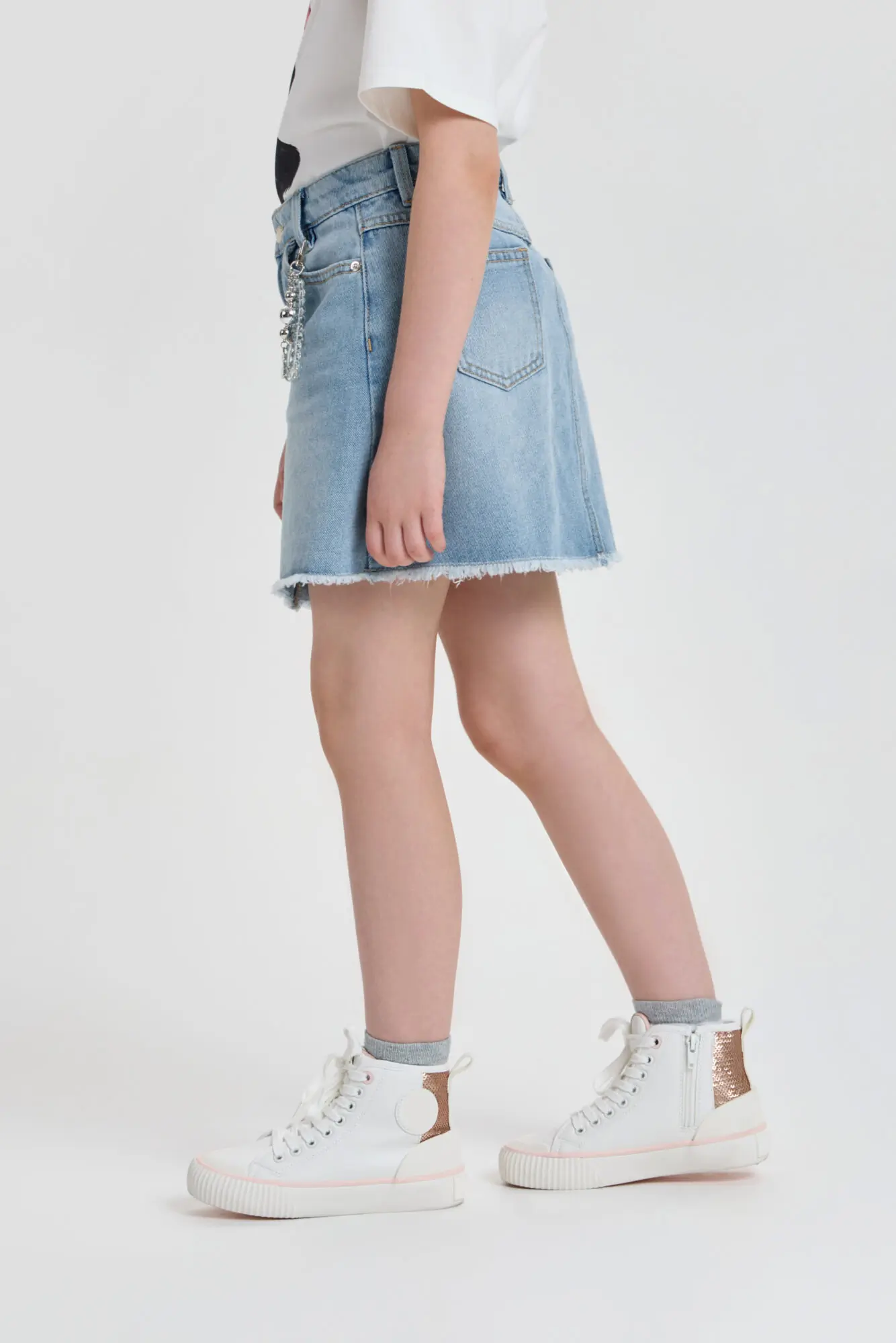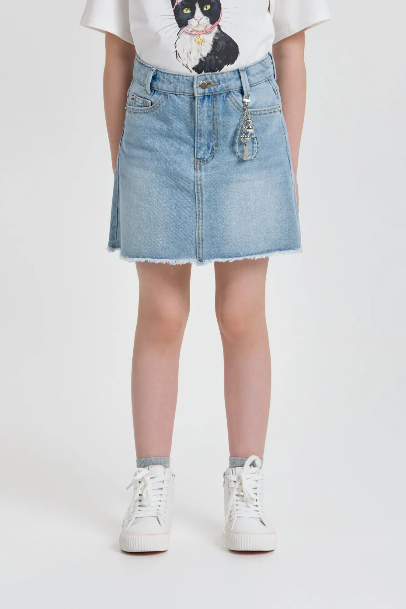 Юбка из денима – незаменимая вещь в ежедневном гардеробе девочки. Модель трапециевидного силуэта выглядит модно и актуально. Карманы, расположенные сбоку и сзади, делаю юбку не только ... красивой, но и удобной. Застежка на молнию и пуговицу, шлевки для ремня и возможность регулировки талии гарантируют идеальную посадку по фигуре ребенка. Стильный брелок завершает образ.