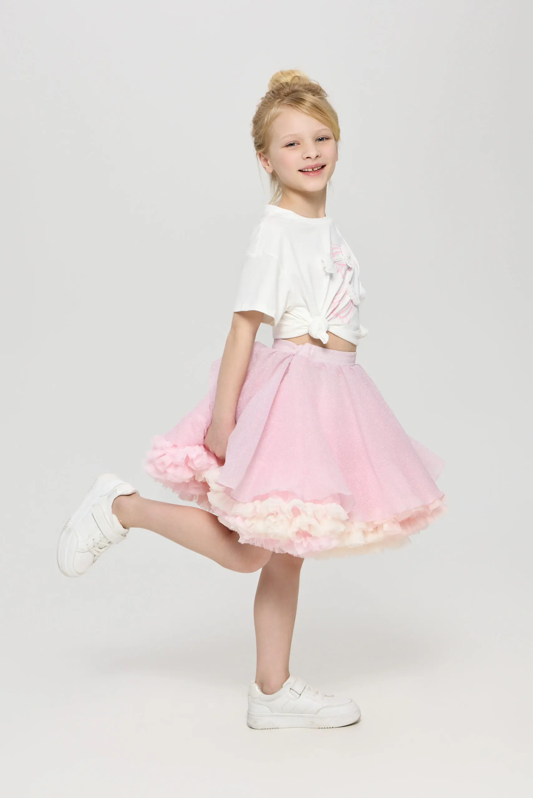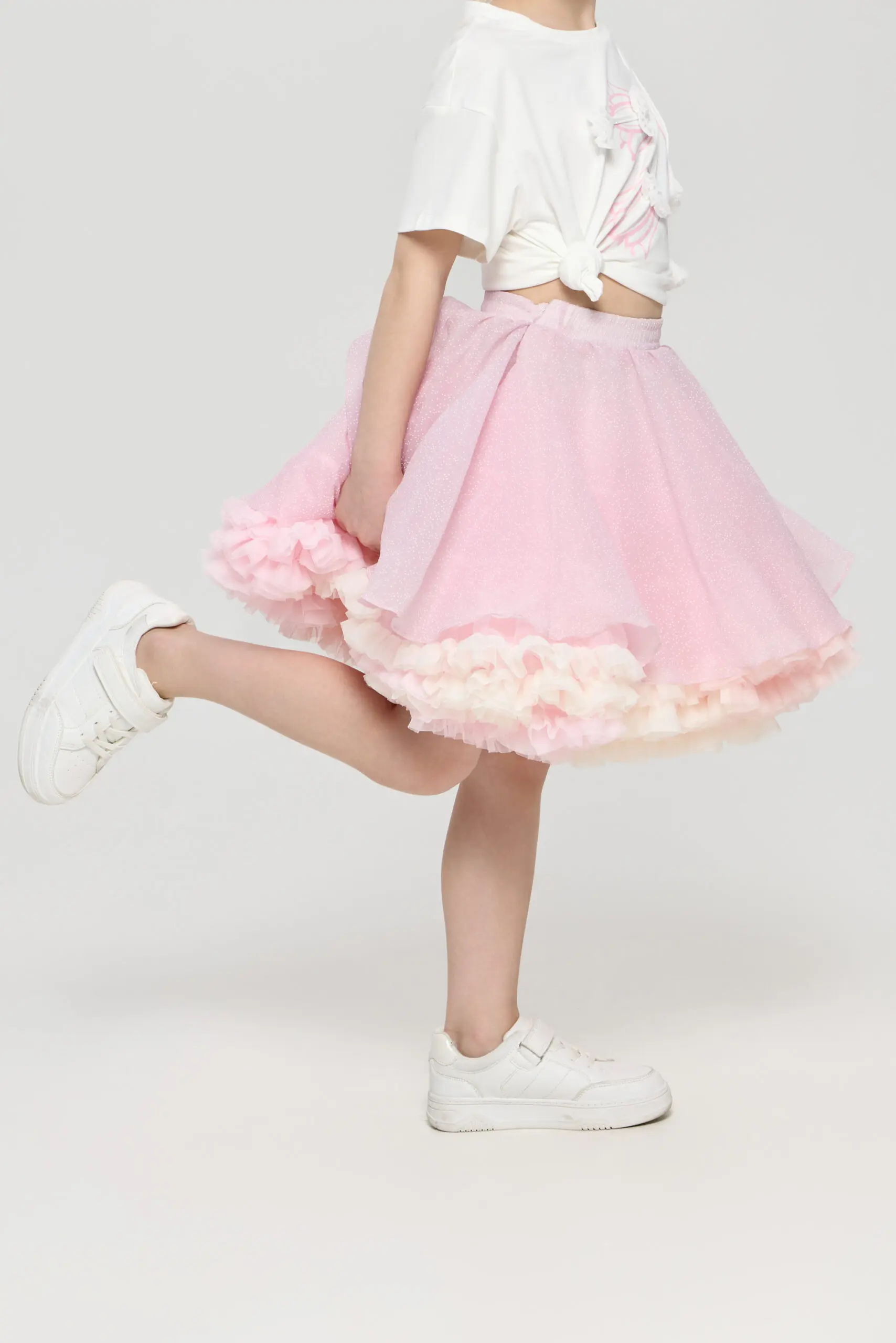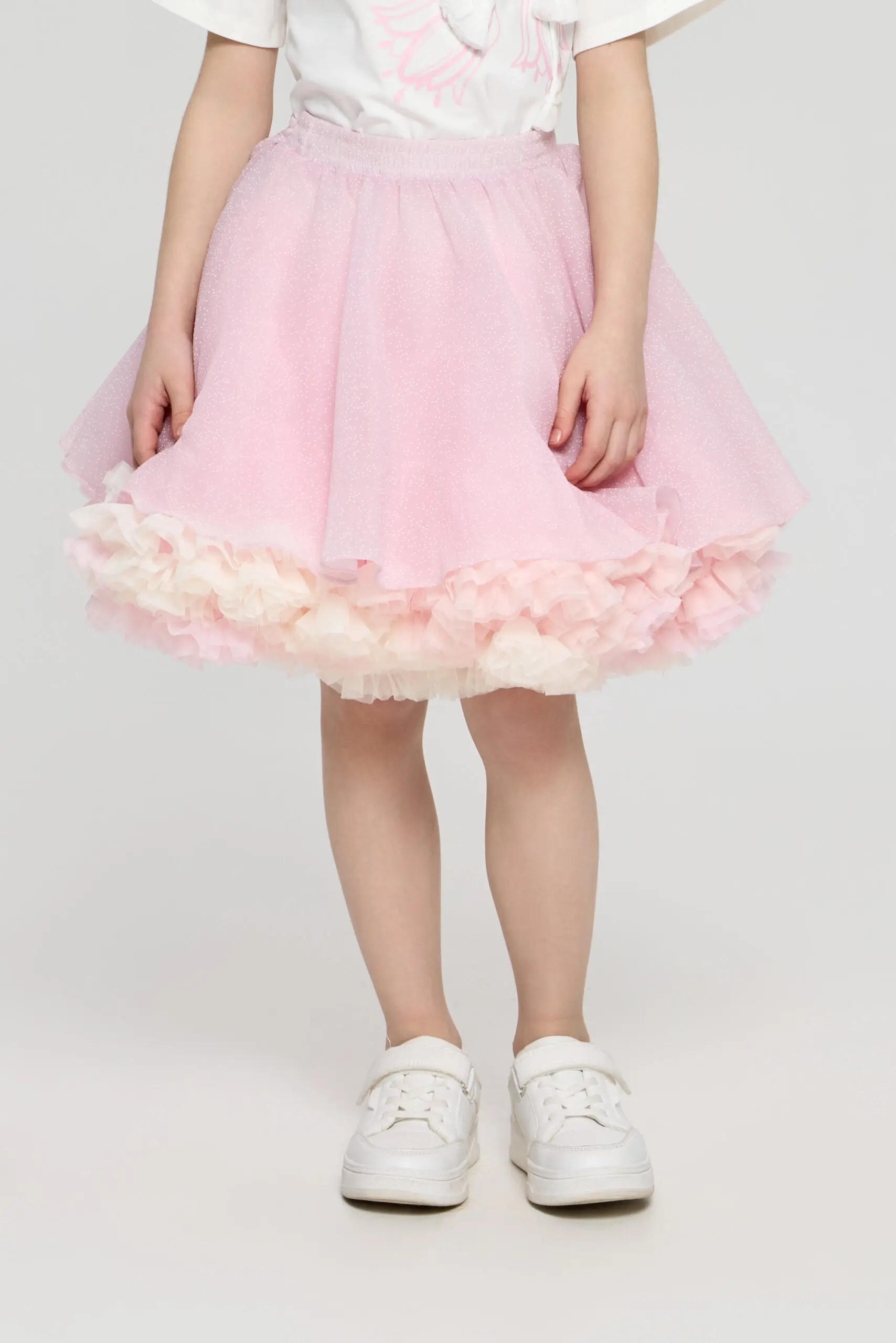 Эластичный пояс обеспечивает ... комфортную и удобную посадку, позволяя легко надевать юбку. Подъюбник добавляет дополнительный объем, создавая игривый и романтичный силуэт.