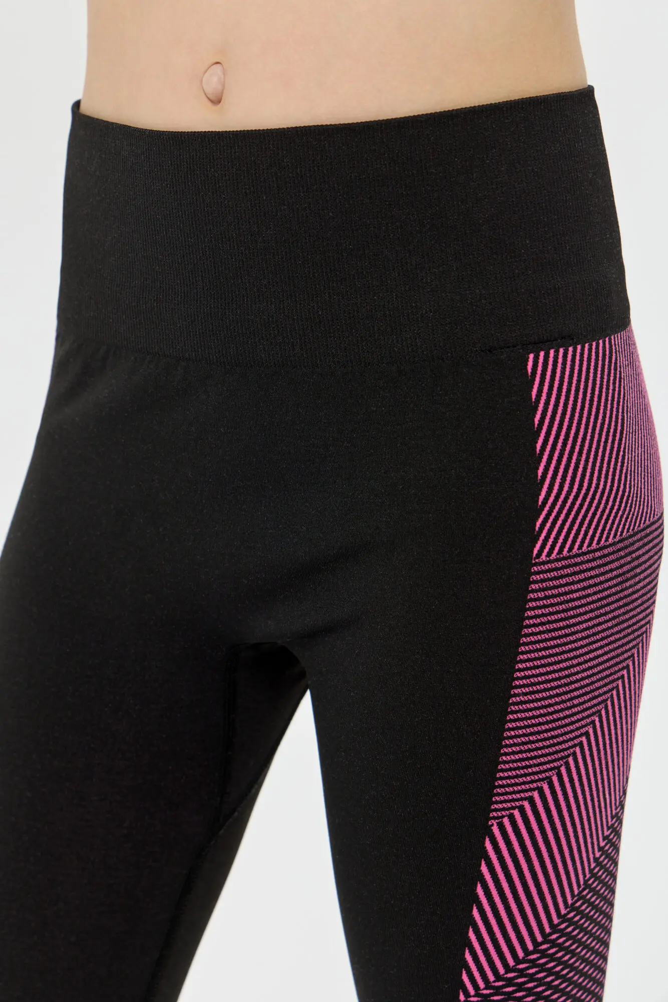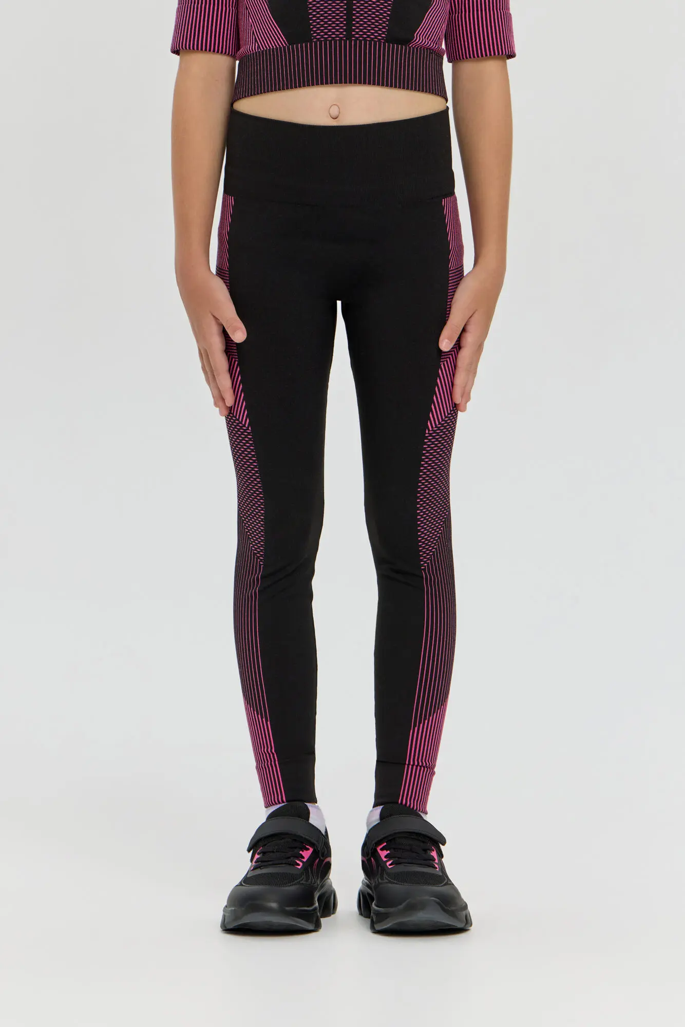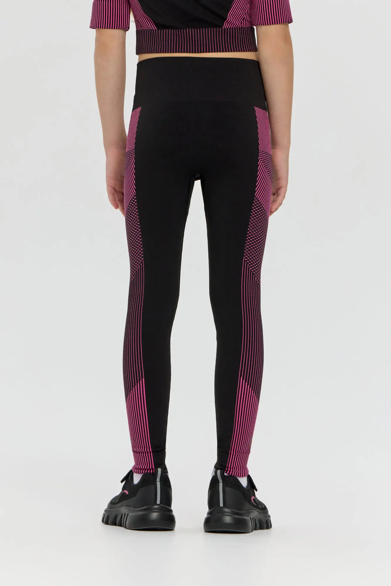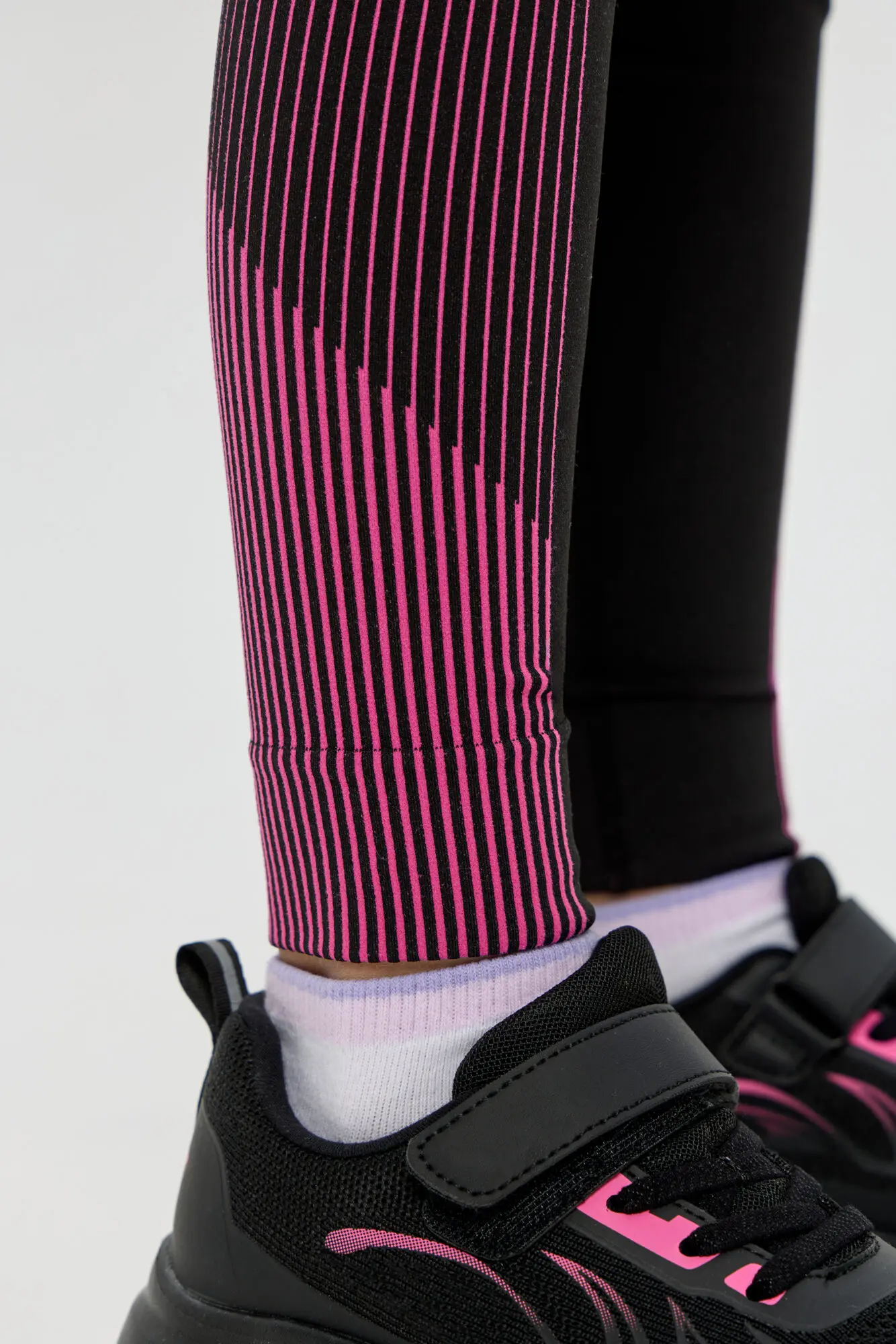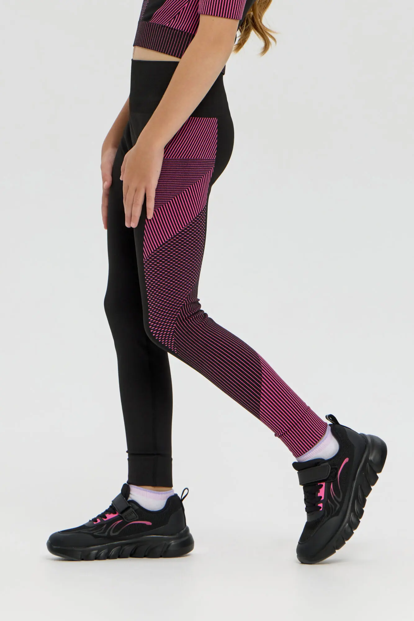Чёрно-розовые спортивные леггинсы – превосходный и модный вариант для активных девочек. Эластичный материал с высоким содержанием полиэстера и нейлона обеспечивает плотную посадку. Контрастные вставки зрительно вытягивают ... силуэт и придают образу динамику. Прекрасно подойдут для занятий танцами, фитнес-тренировок, упражнений йоги и подвижных игр.