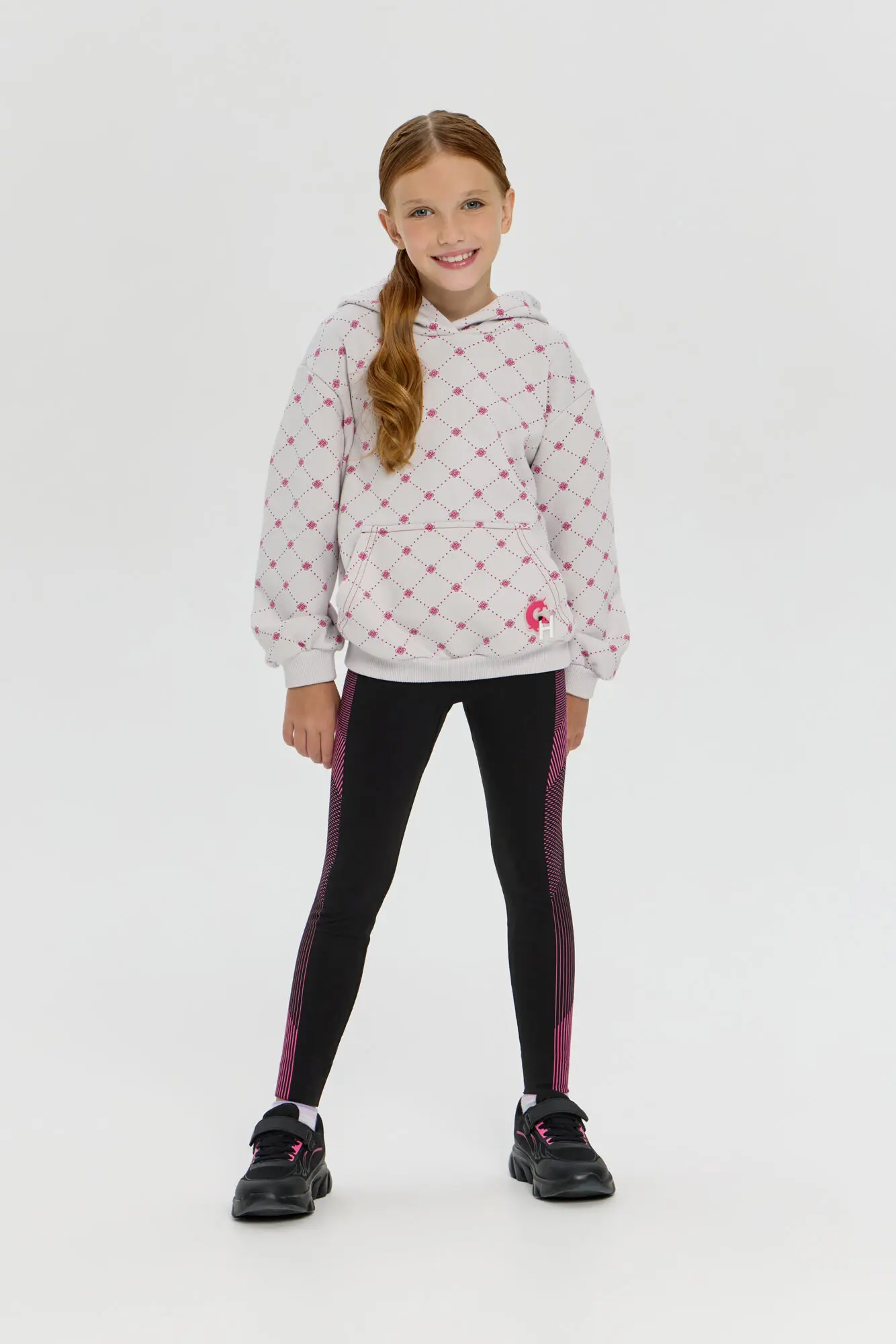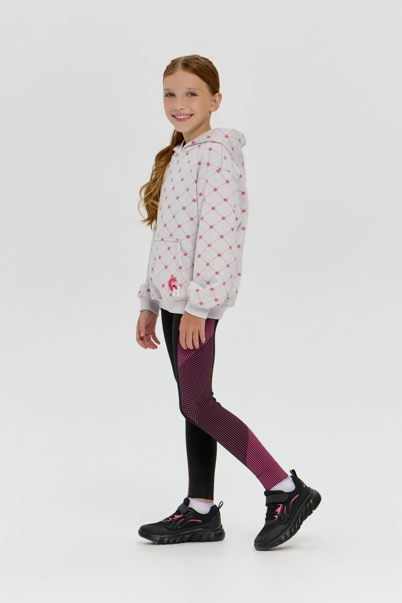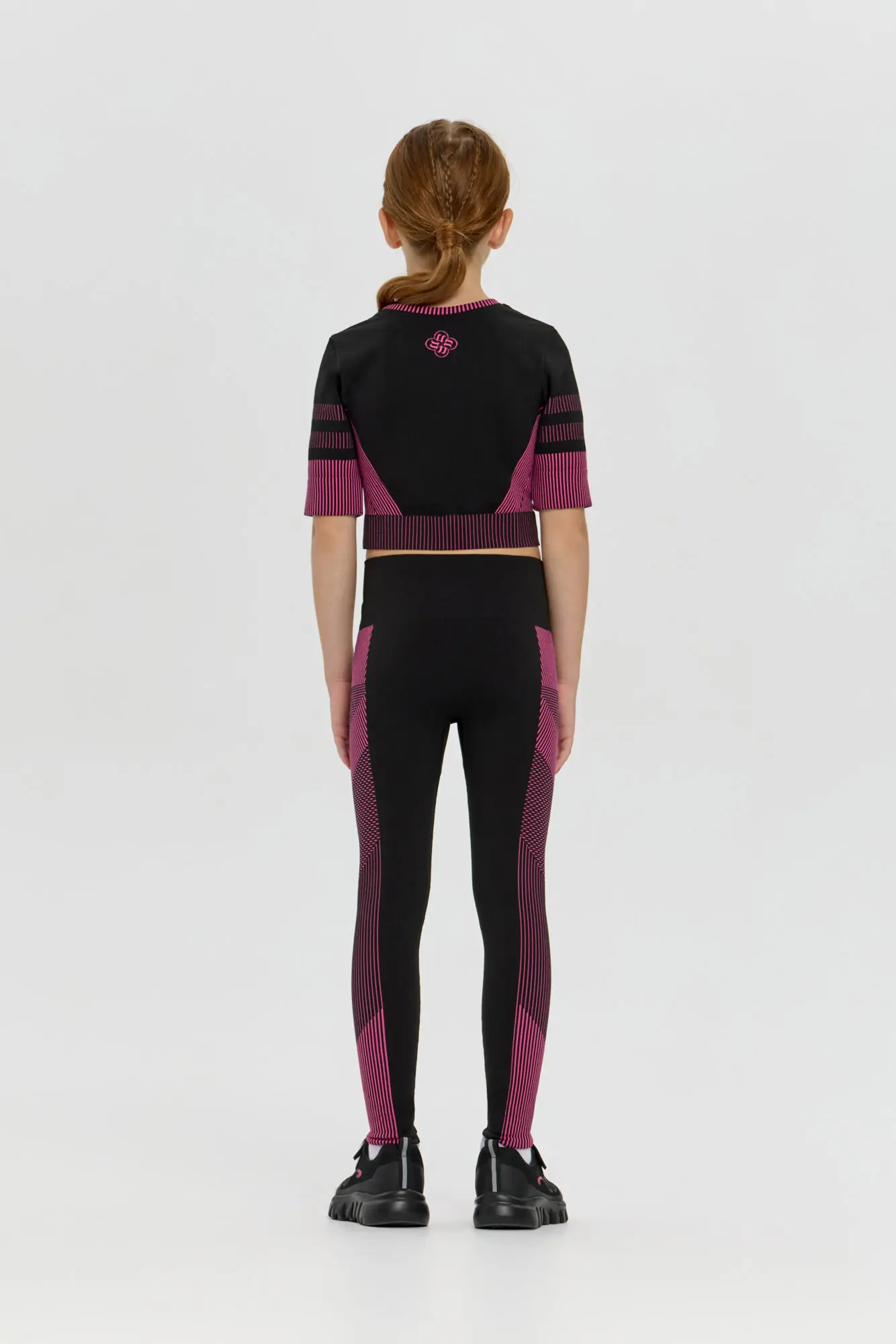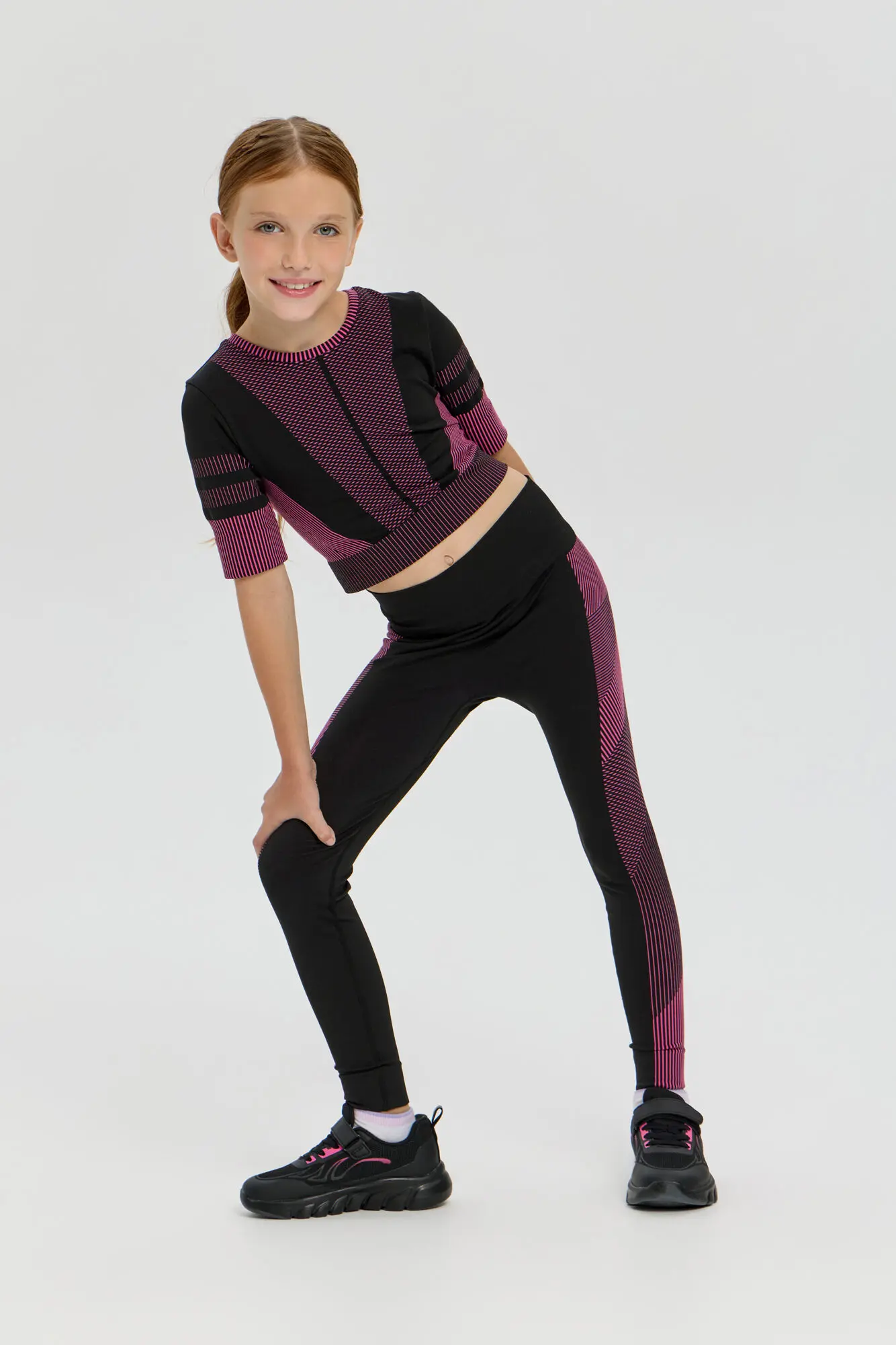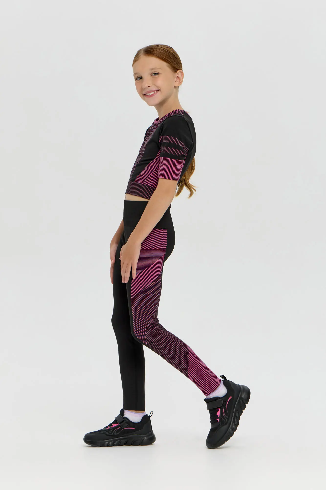 Чёрно-розовые спортивные леггинсы – превосходный и модный вариант для активных девочек. Эластичный материал с высоким содержанием полиэстера и нейлона обеспечивает плотную посадку. Контрастные вставки зрительно вытягивают ... силуэт и придают образу динамику. Прекрасно подойдут для занятий танцами, фитнес-тренировок, упражнений йоги и подвижных игр.