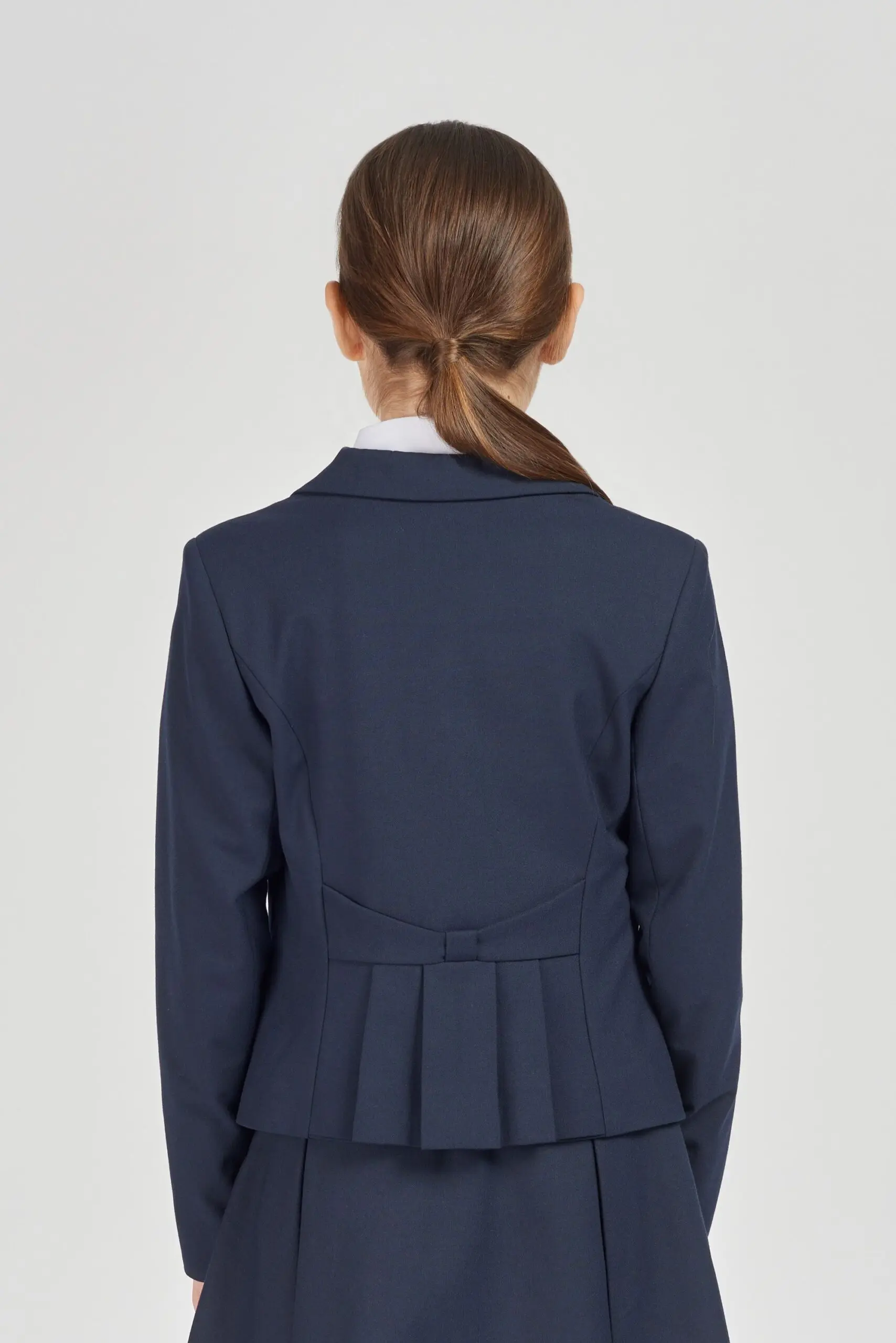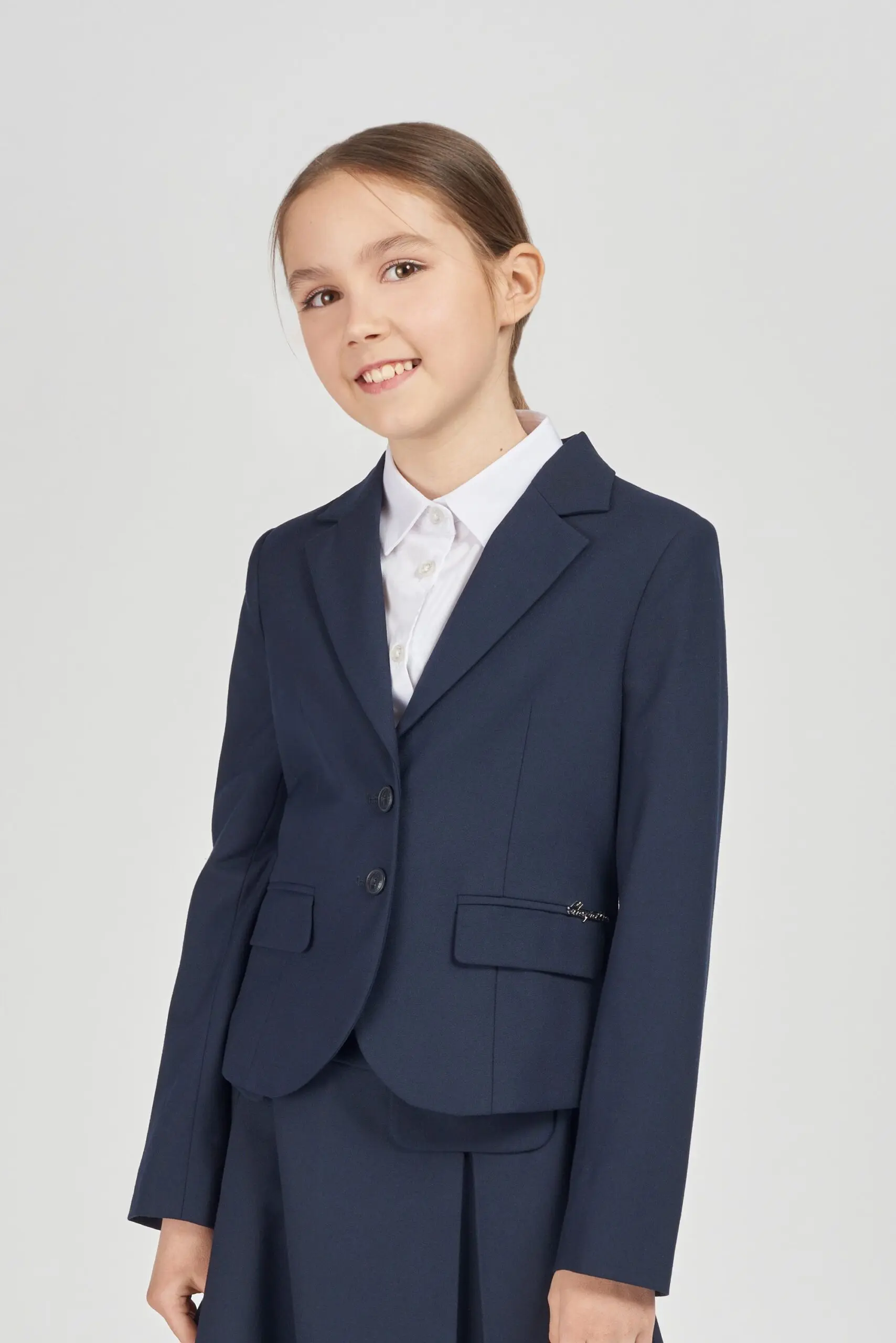 Элегантный жакет прилегающего силуэта из костюмной ткани синего цвета для девочки. Модель застегивается на две фирменные пуговицы. По бокам прорезные карманы, слева − эффектный логотип бренда. ... Спинка изделия оформлена баской и красивым декором в виде банта. Идеальная посадка по фигуре. Подклад из 100% вискозы. Стильный и неотъемлемый элемент гардероба школьницы.