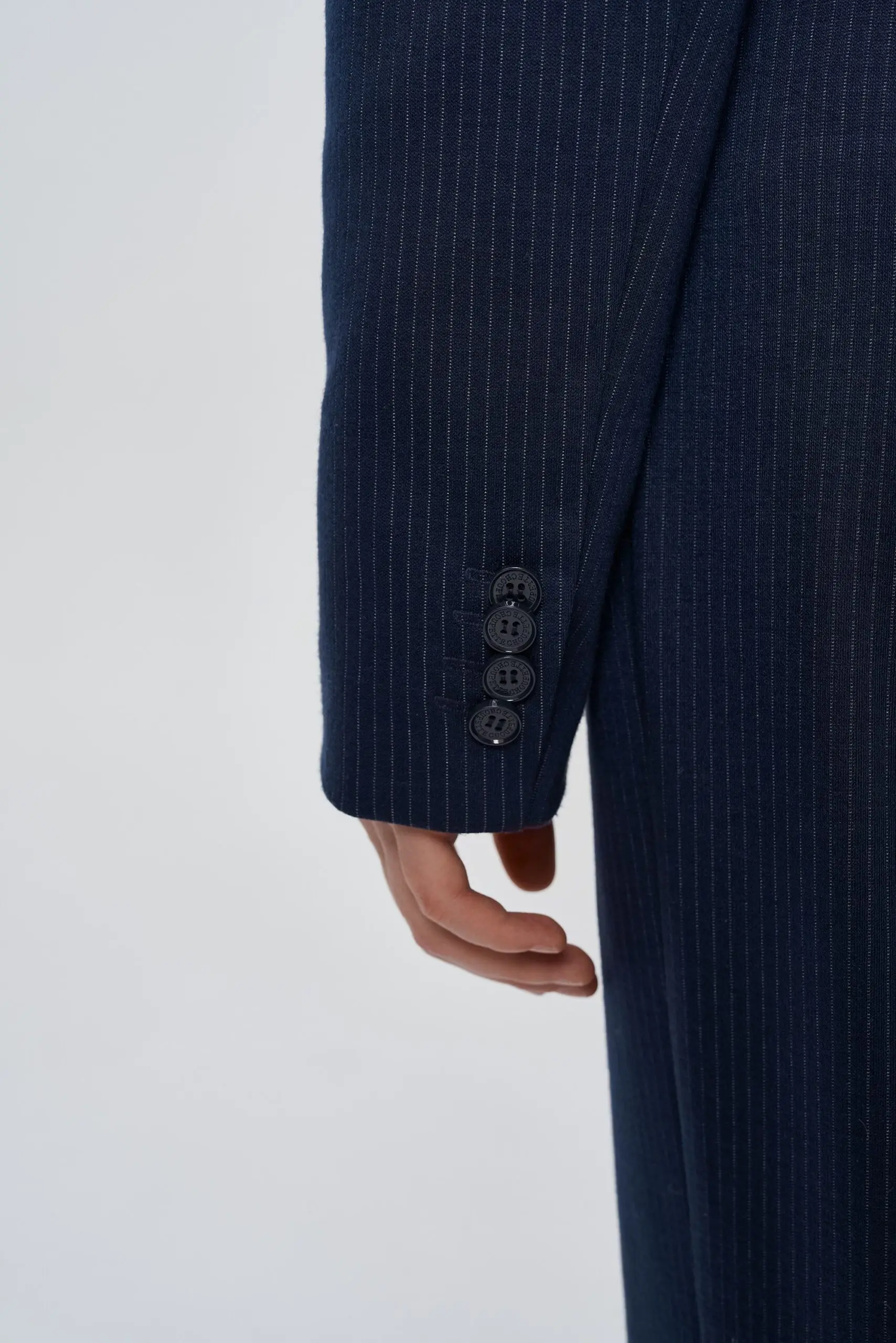 Оригинальный жакет из джерси в синюю полоску отлично подойдет для официального дресс-кода, главное − продумать капсульный гардероб.