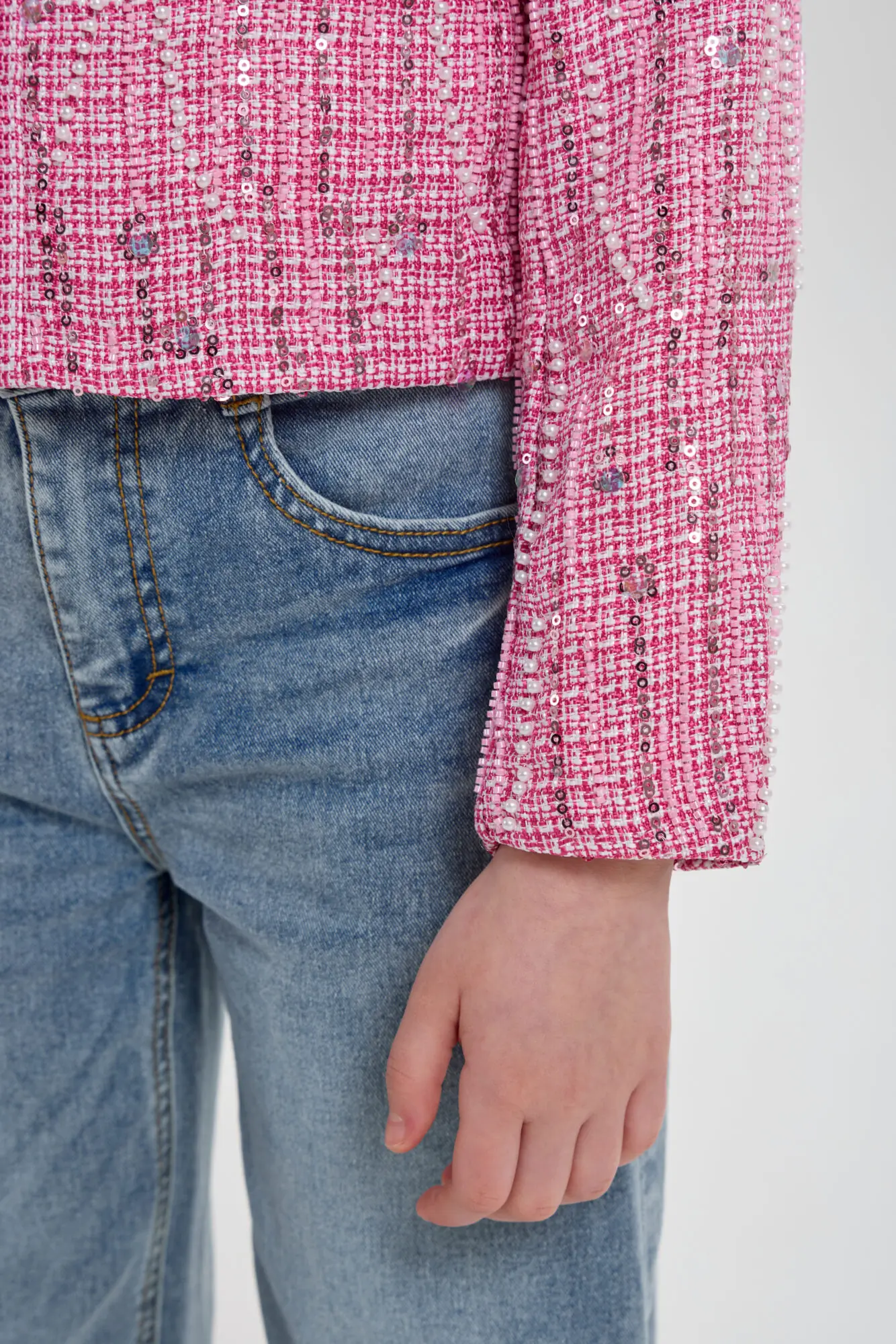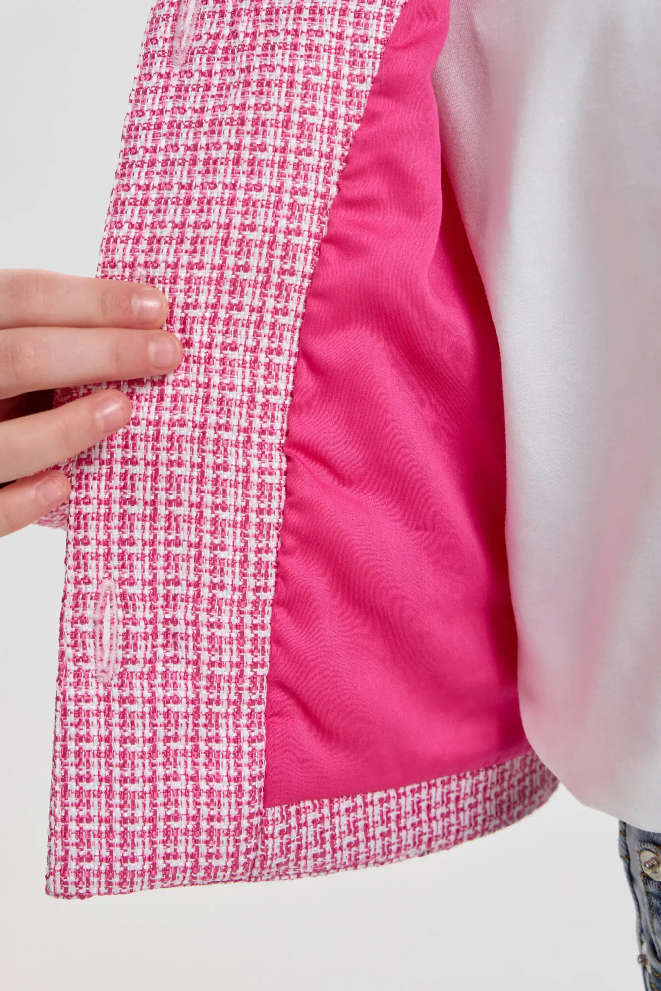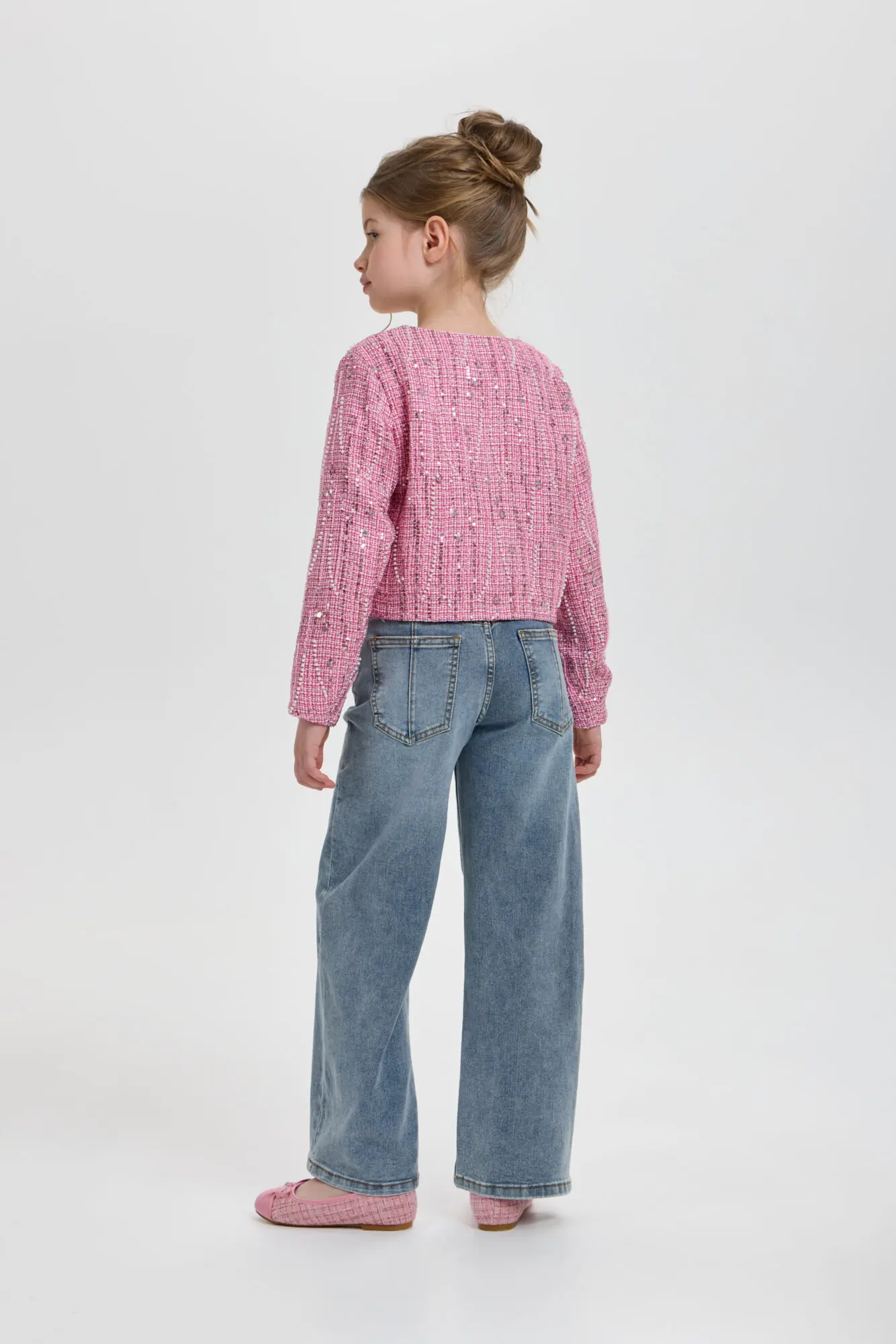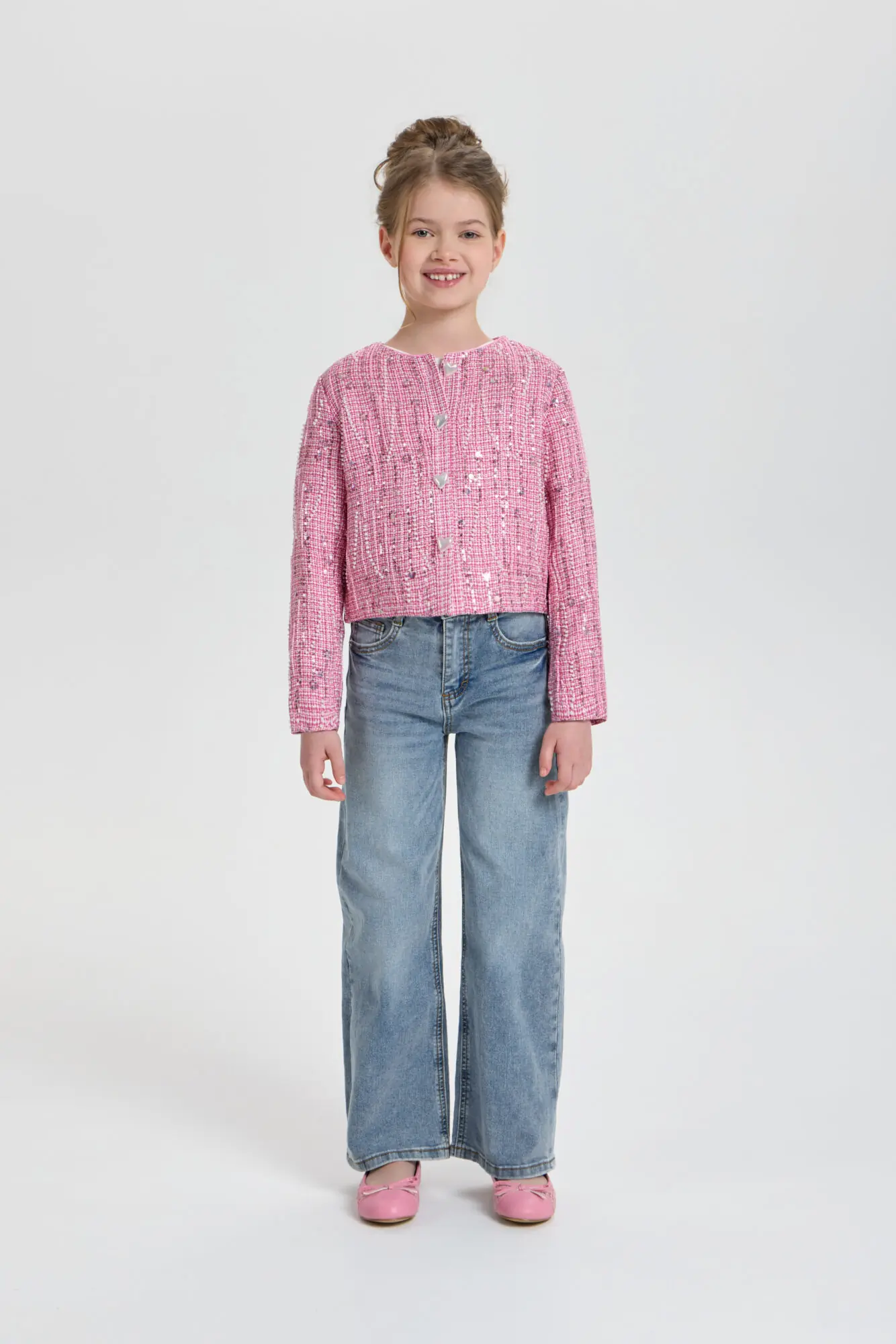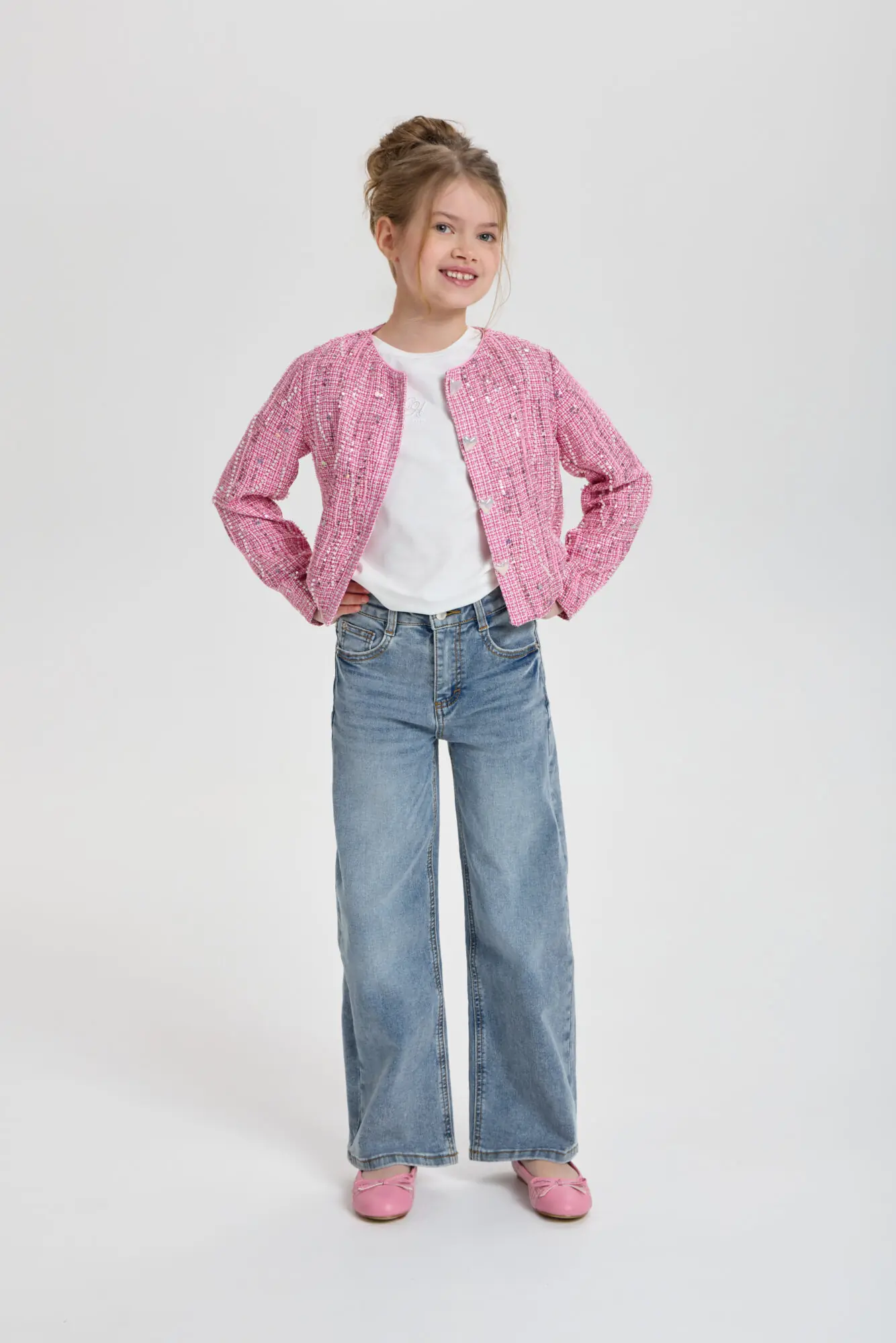 Жакет для девочки до сих пор является актуальным элементом гардероба для тех, кто любит практичные вещи. Данная модель имеет прямой крой, что обеспечивает лёгкость в сочетании ... с другими элементами одежды. Подкладка из натурального хлопка придаёт жакету дополнительный комфорт, позволяя коже дышать и создавая приятные ощущения при носке. Яркий декор в виде пайеток и страз, контрастные пуговицы, выполненные в стильном дизайне, акцентируют внимание на детали, привнося нотку оригинальности и изысканности в общий образ. Этот жакет легко вписывается в различные стили: от повседневного до более нарядного. Его можно сочетать с джинсами, юбками или платьями, создавая множество уникальных образов для разных случаев.