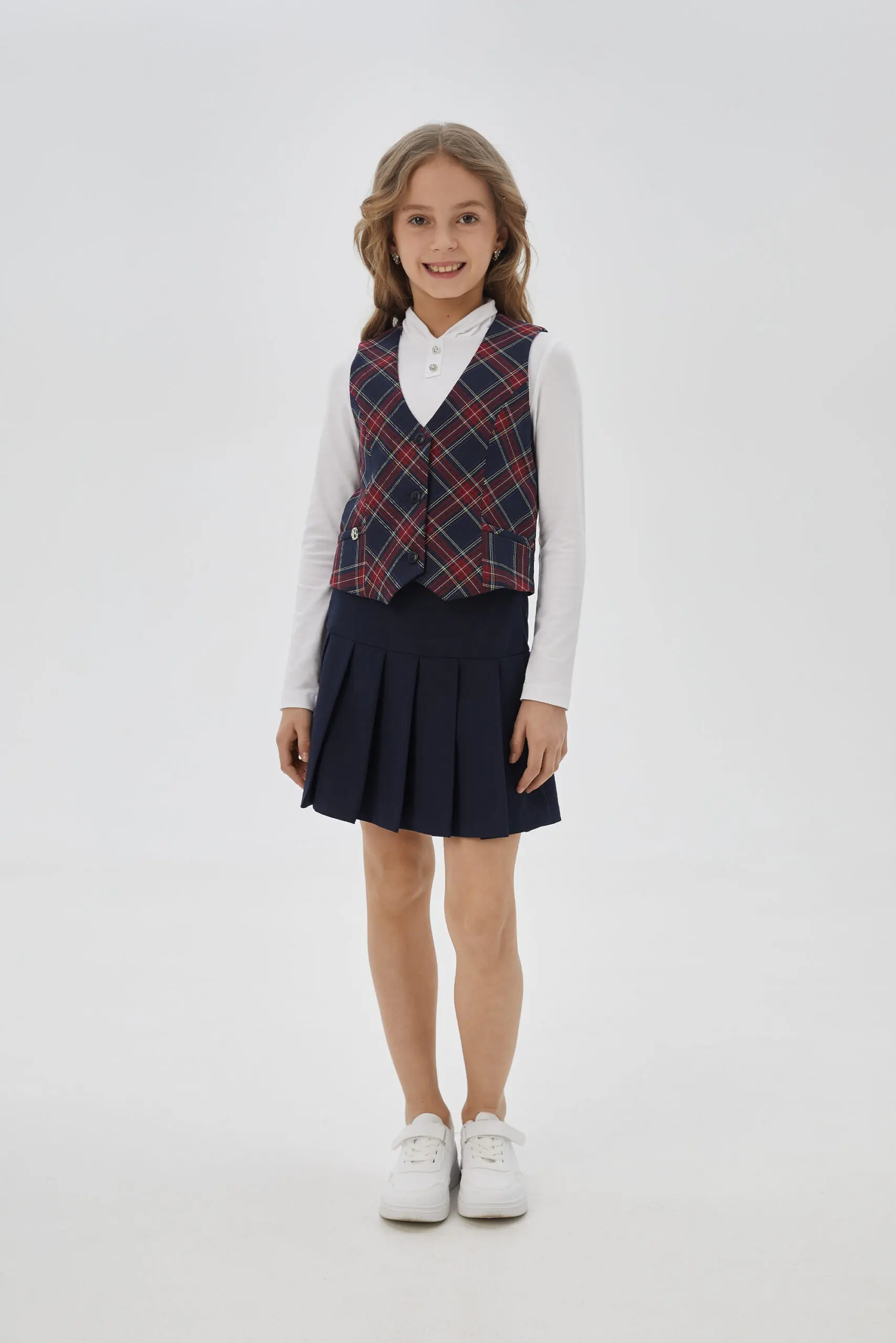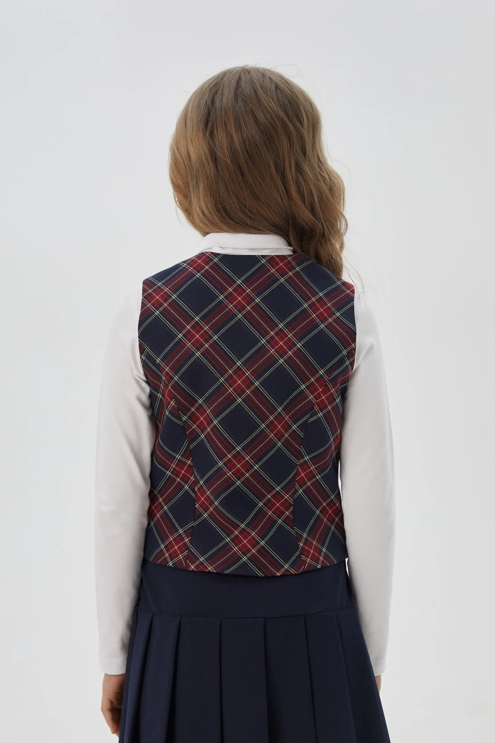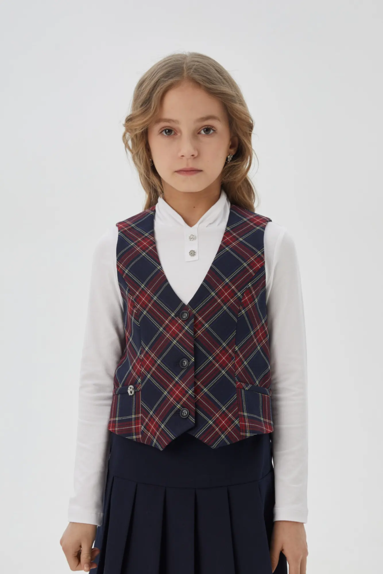 Бордовый школьный жилет из костюмной ткани ломает все стереотипы! Модель с V-образным вырезом и очаровательным принтом в клетку понравится каждой моднице. Наряд приталенного силуэта с рельефными ... швами отлично сидит на фигуре. Спереди модель застегивается на фирменные пуговицы. По низу полочек два кармашка. Такая вещь сочетается с любыми блузками, юбками и брюками.