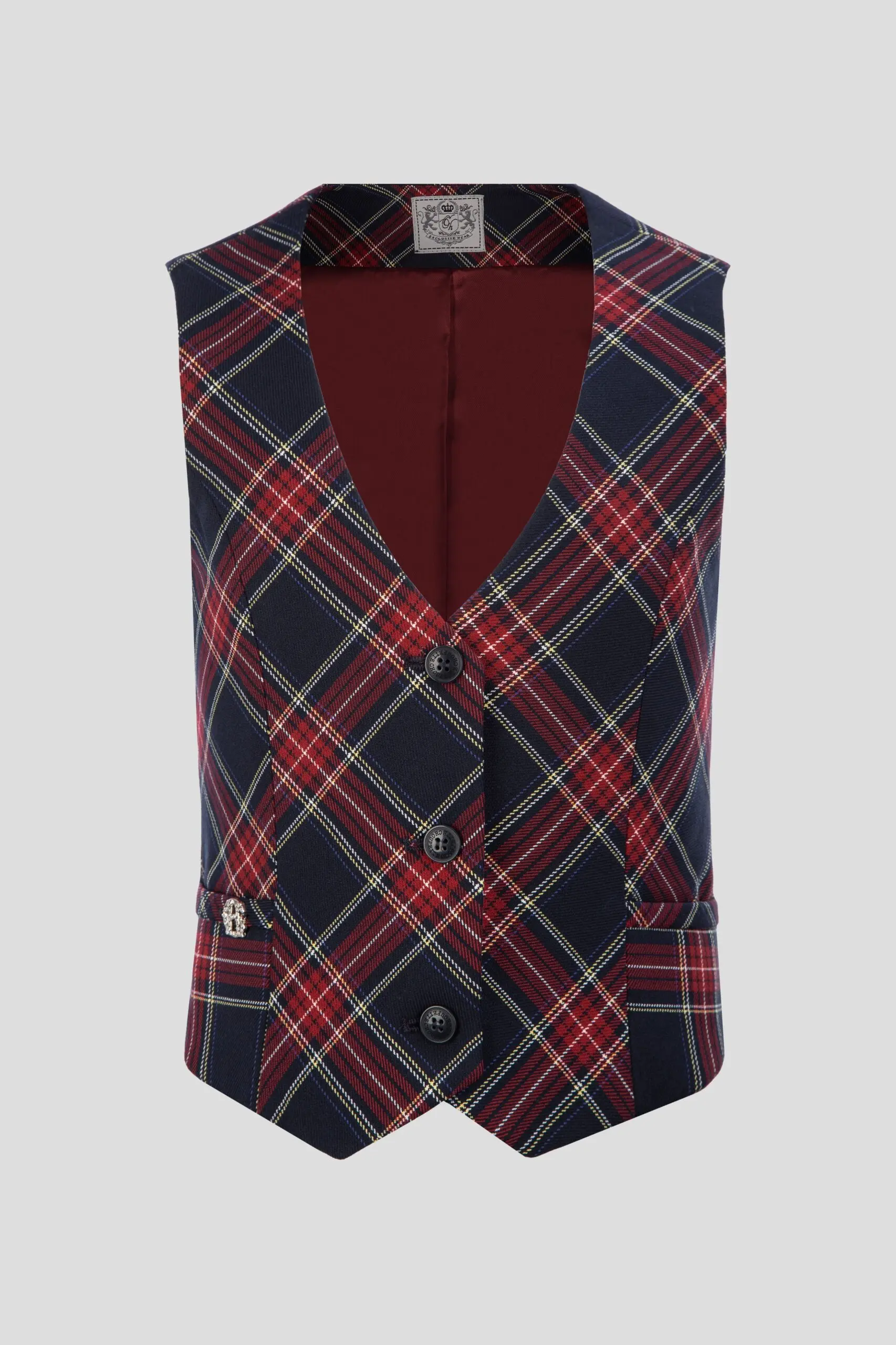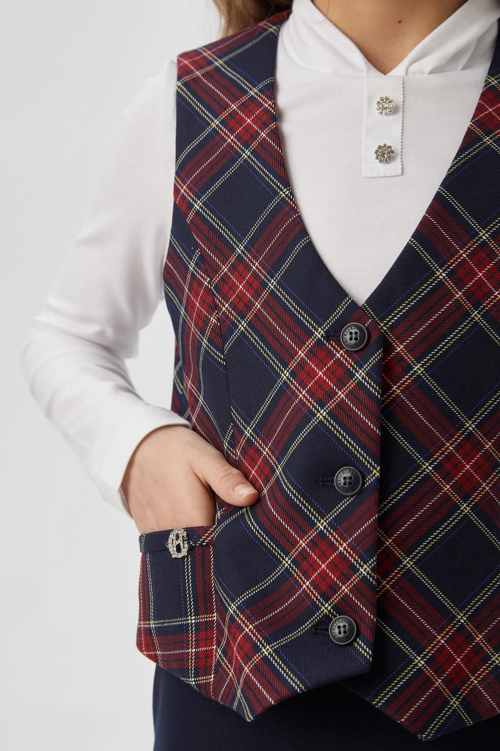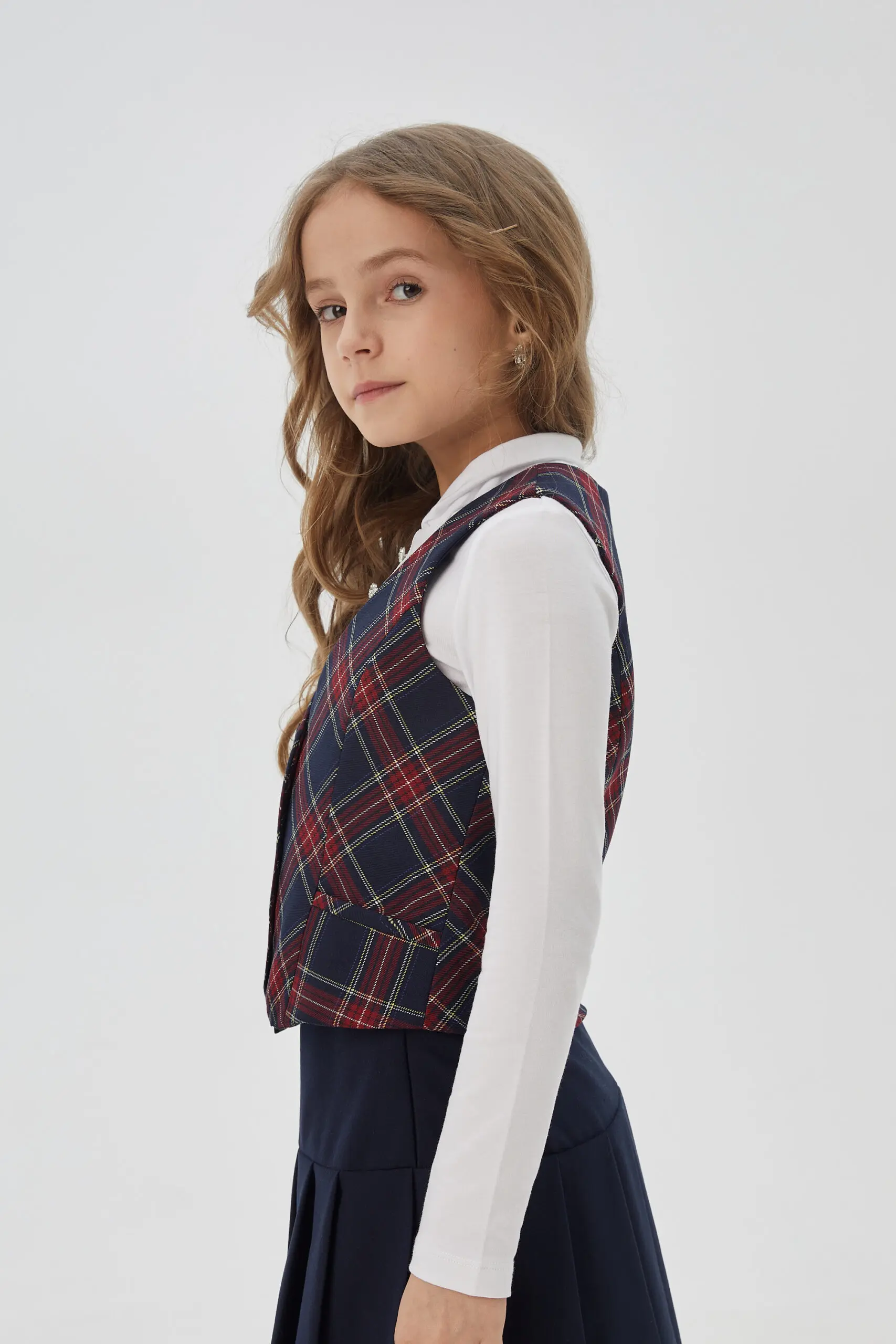 Бордовый школьный жилет из костюмной ткани ломает все стереотипы! Модель с V-образным вырезом и очаровательным принтом в клетку понравится каждой моднице. Наряд приталенного силуэта с рельефными ... швами отлично сидит на фигуре. Спереди модель застегивается на фирменные пуговицы. По низу полочек два кармашка. Такая вещь сочетается с любыми блузками, юбками и брюками.