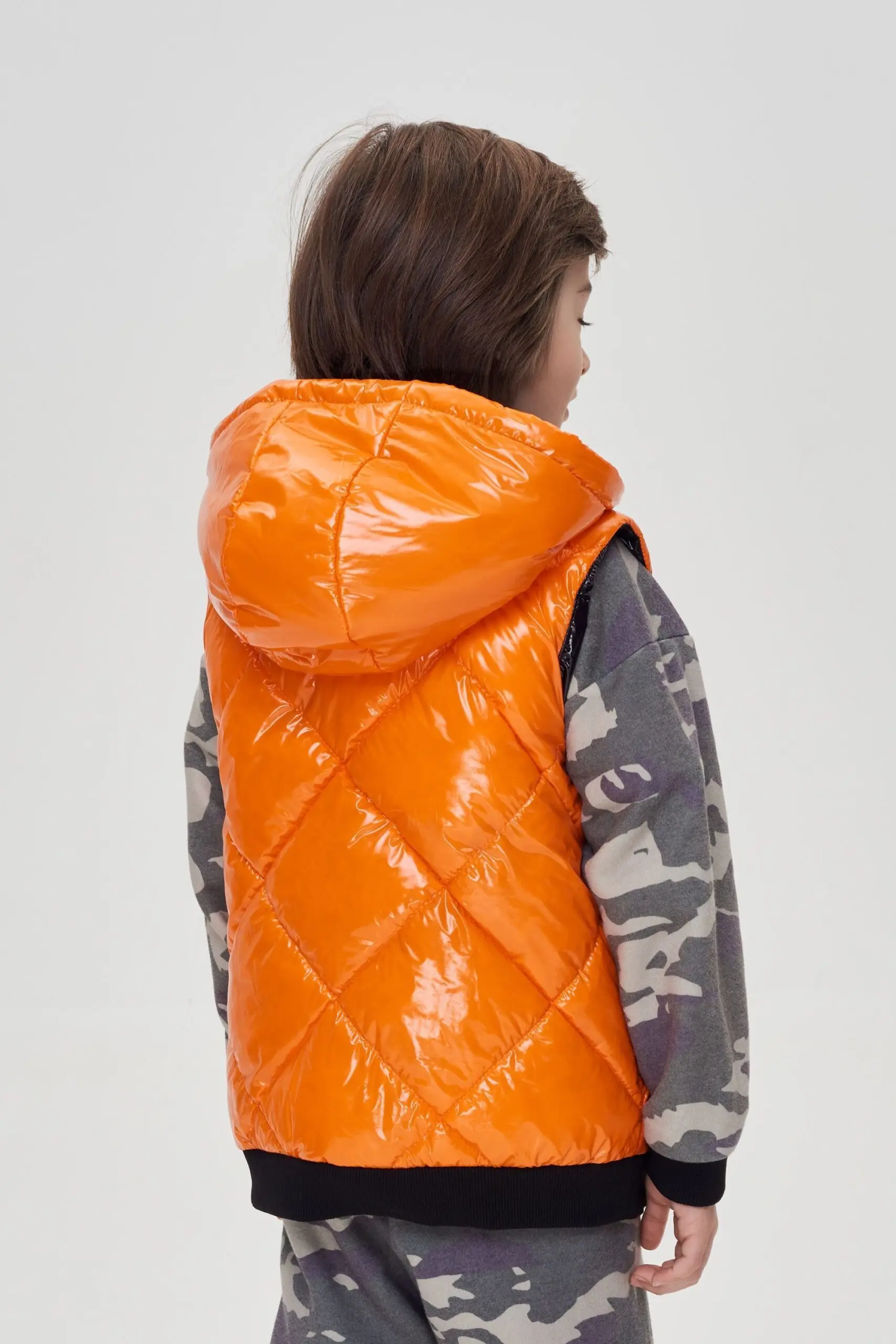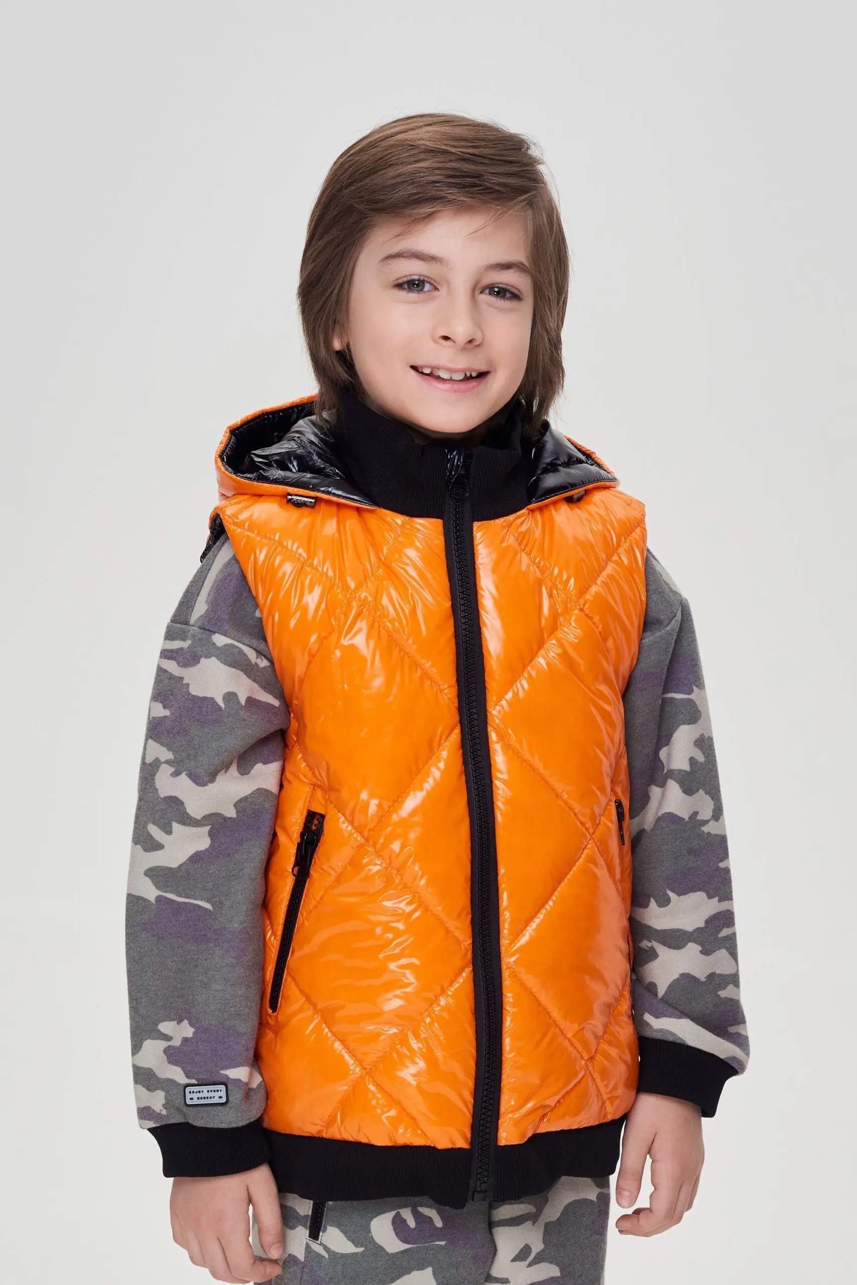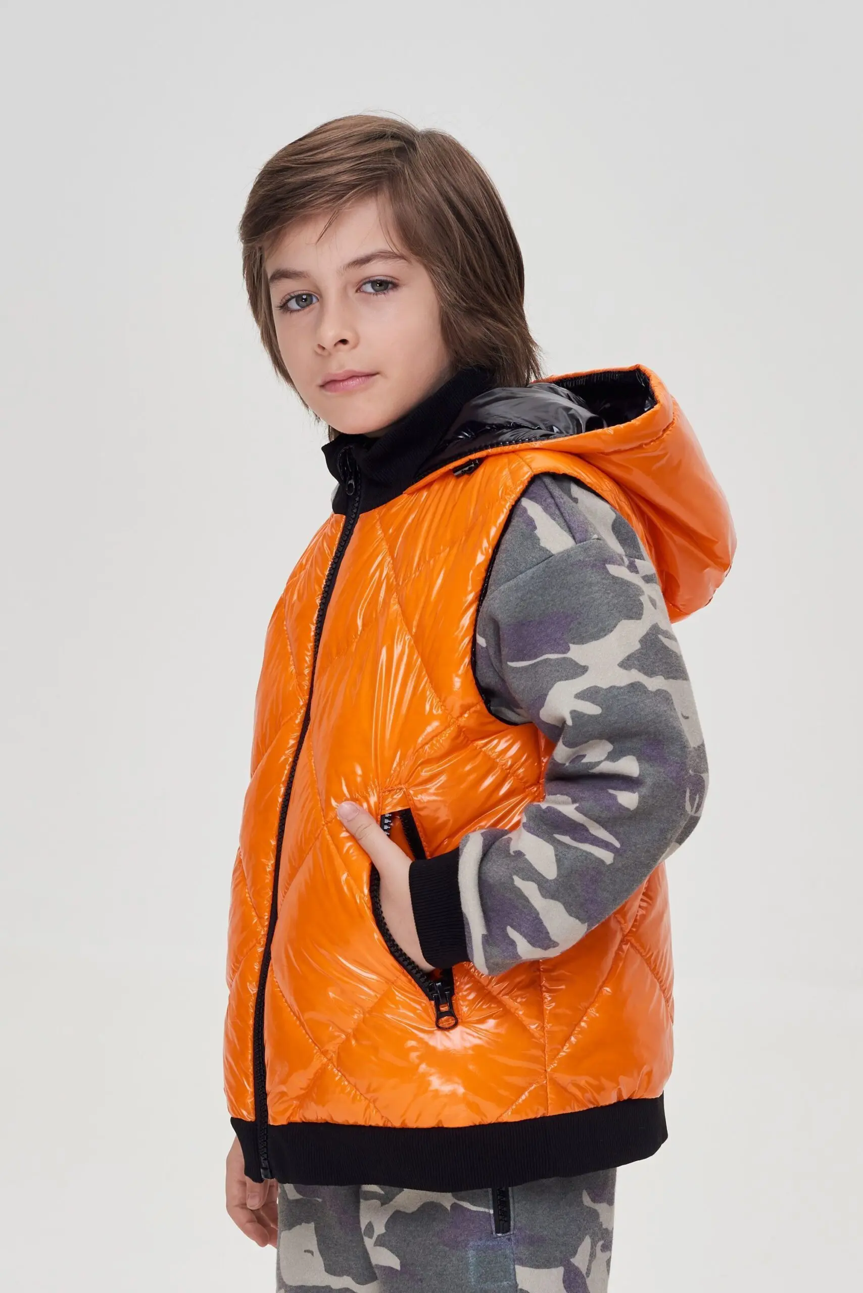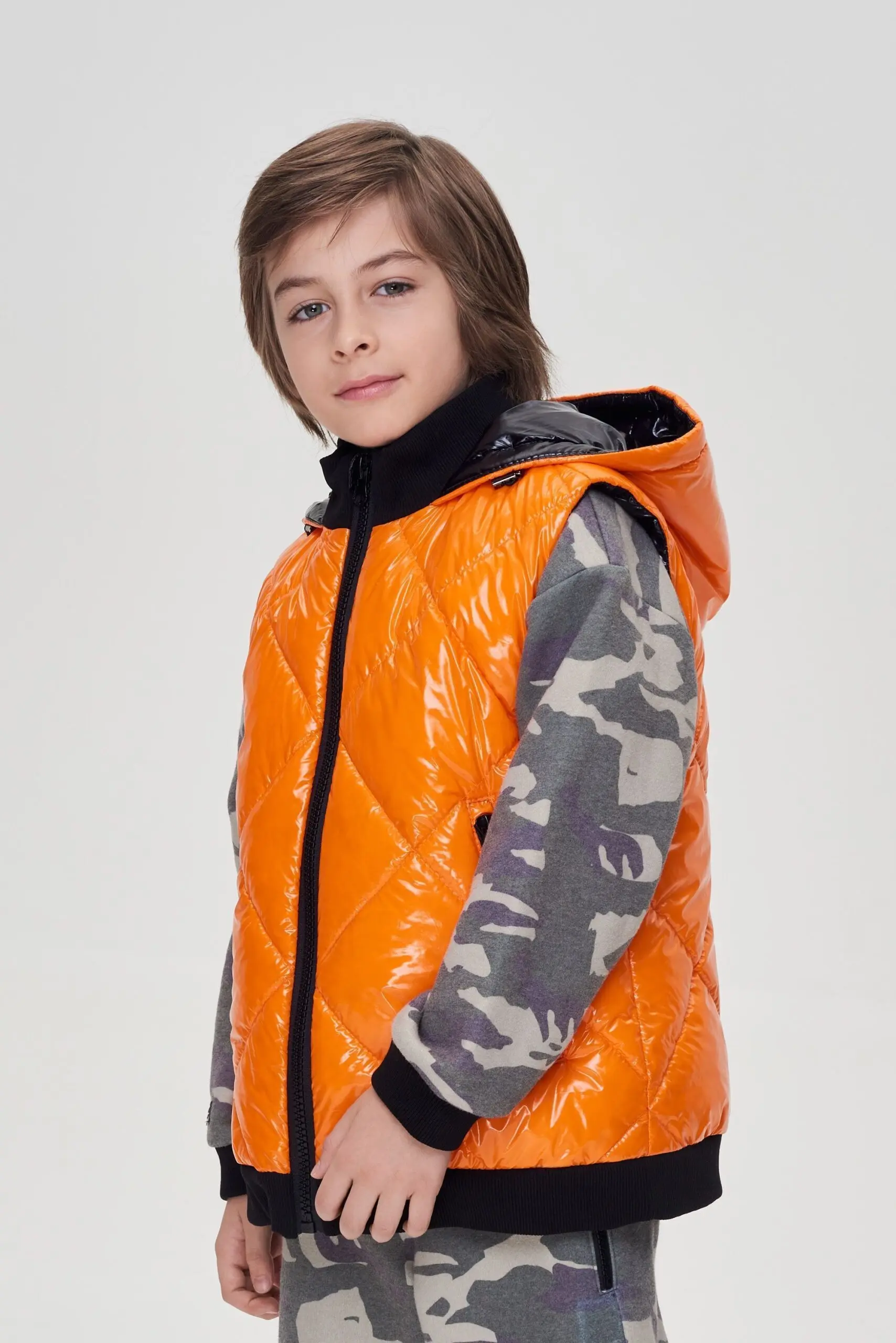 Традиционно детские наряды декорируют вышивкой, аппликациями и красочными принтами. Но многие подростки предпочитают стильные однотонные вещи. Яркий утеплённый жилет для мальчика насыщенного оттенка «каре» позволит юному ... тинейджеру выделиться среди сверстников. Оригинальная модель свободного силуэта с карманами застёгивается на молнию. Такой предмет гардероба позволит создавать нестандартные уличные луки.