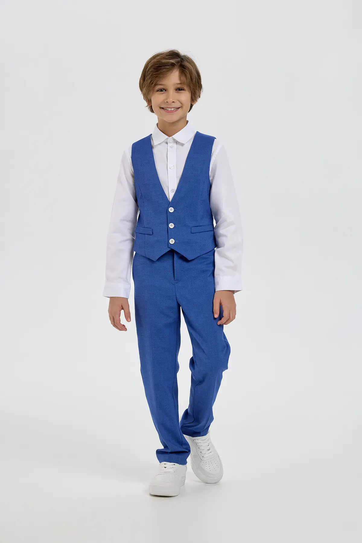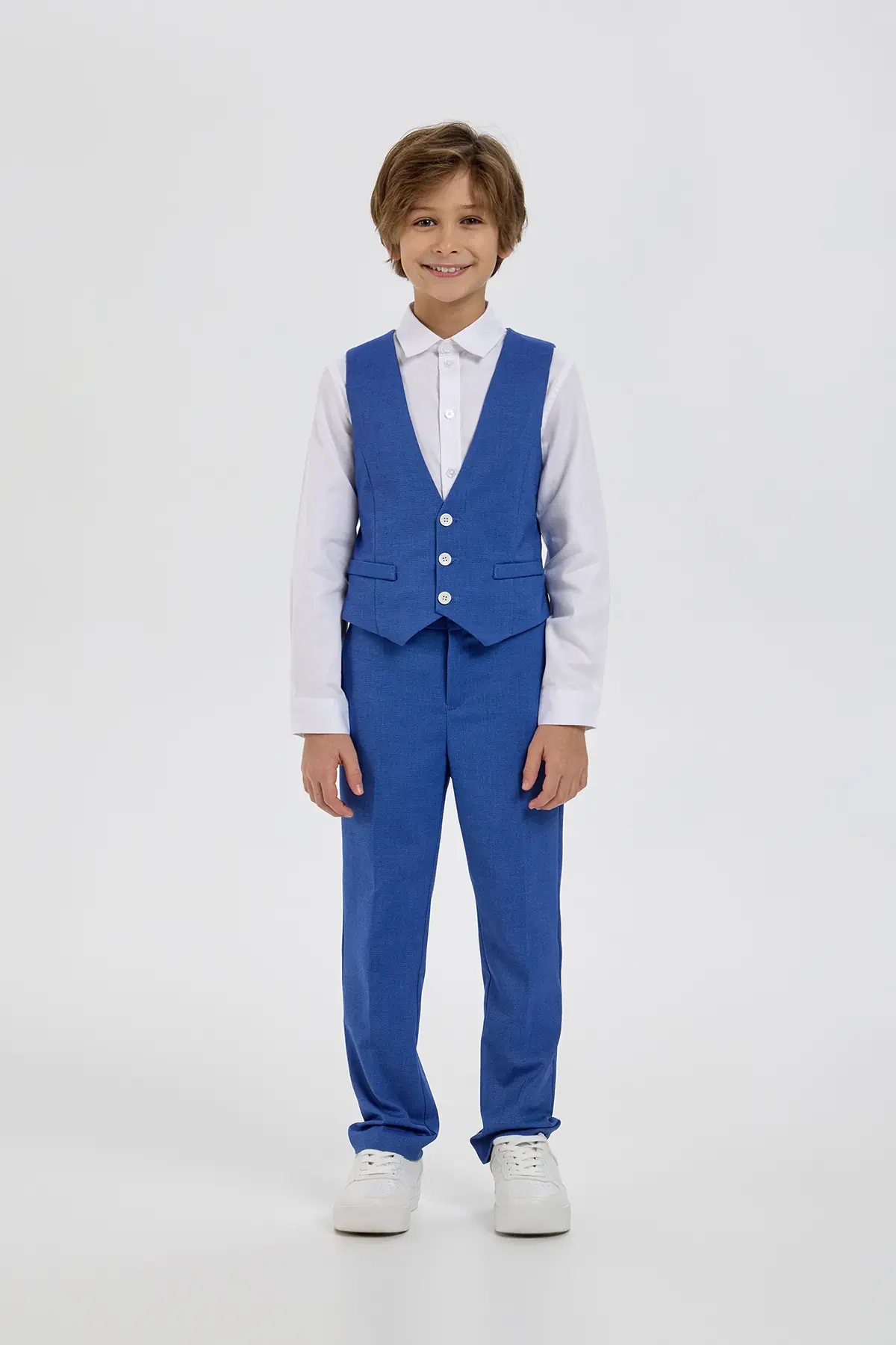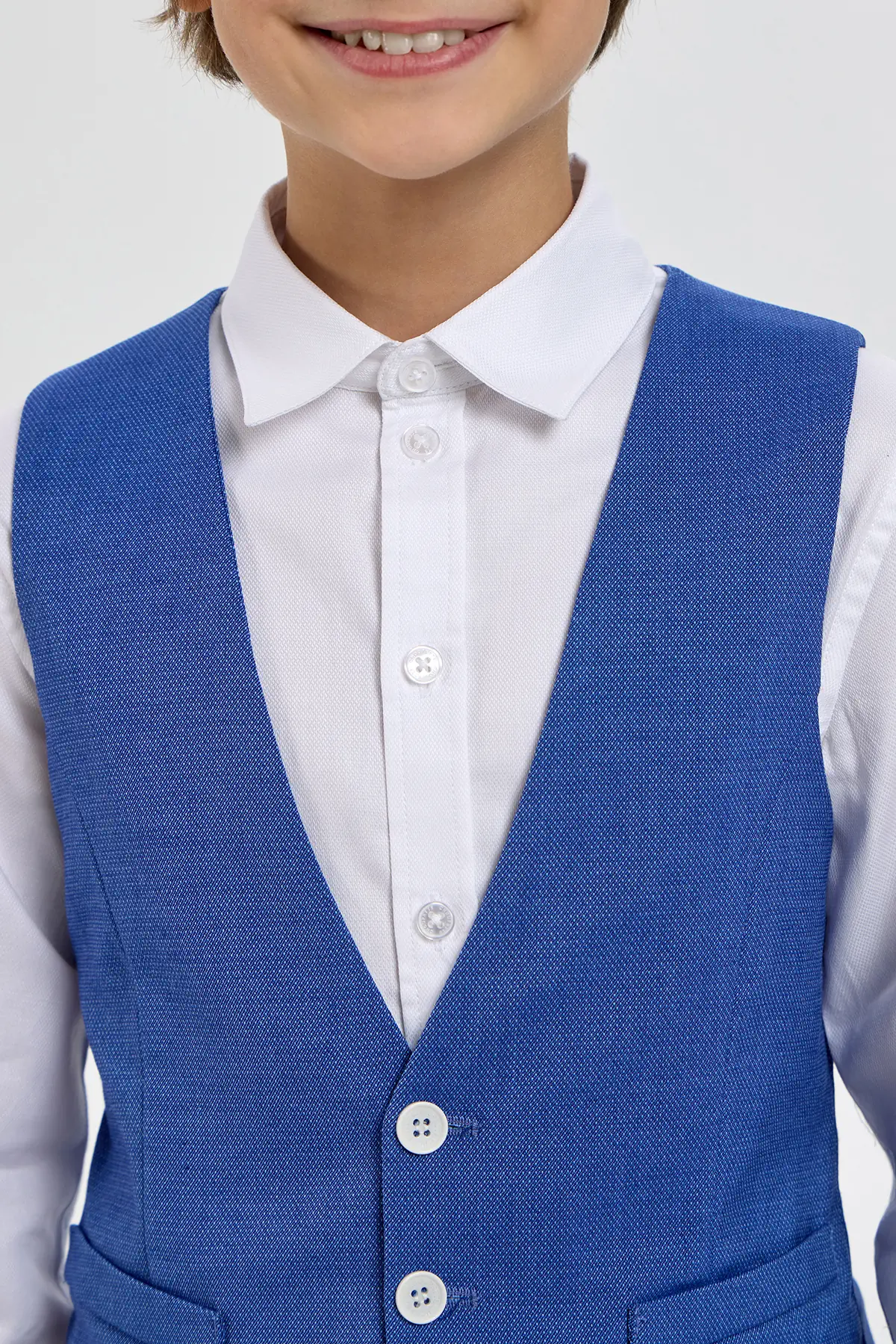 Эффектный жилет в выразительном синем оттенке станет стильным элементом нарядного гардероба мальчика. Модель аккуратного приталенного силуэта выполнена из материала с лёгкой текстурой, которая придаёт образу глубину ... и завершённость. Классический V-образный вырез, ряд контрастных пуговиц и прорезные карманы формируют элегантный и собранный внешний вид, подчёркивая внимание к деталям. Такой жилет отлично подойдёт для праздничных мероприятий, торжеств и особых случаев, помогая создать гармоничный и запоминающийся образ.