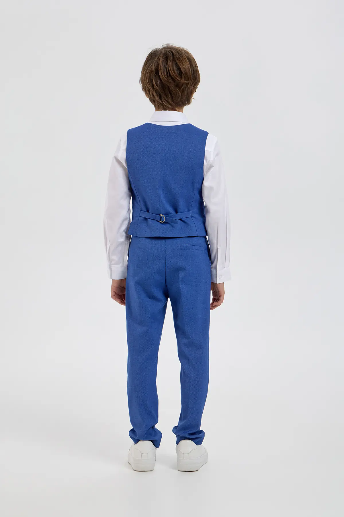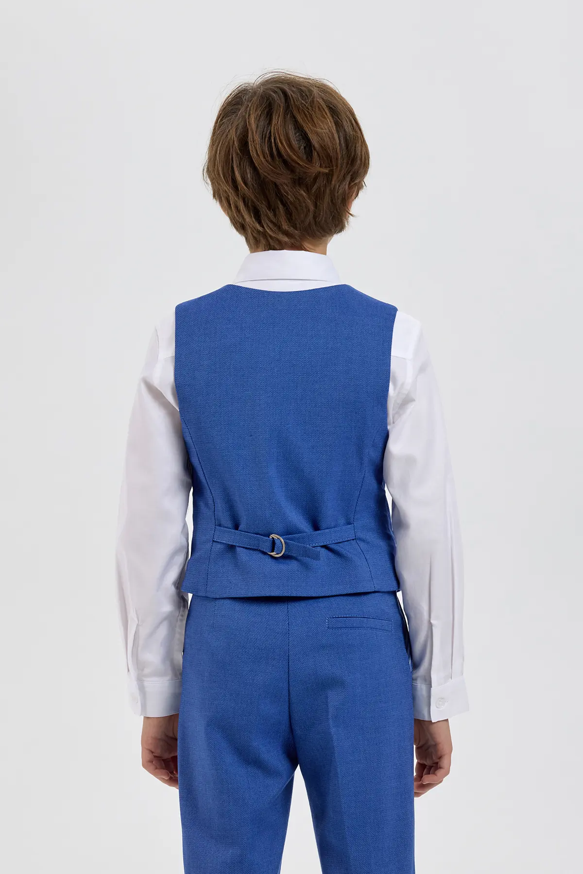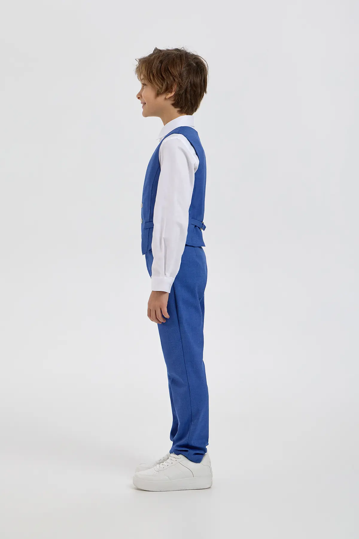 Эффектный жилет в выразительном синем оттенке станет стильным элементом нарядного гардероба мальчика. Модель аккуратного приталенного силуэта выполнена из материала с лёгкой текстурой, которая придаёт образу глубину ... и завершённость. Классический V-образный вырез, ряд контрастных пуговиц и прорезные карманы формируют элегантный и собранный внешний вид, подчёркивая внимание к деталям. Такой жилет отлично подойдёт для праздничных мероприятий, торжеств и особых случаев, помогая создать гармоничный и запоминающийся образ.