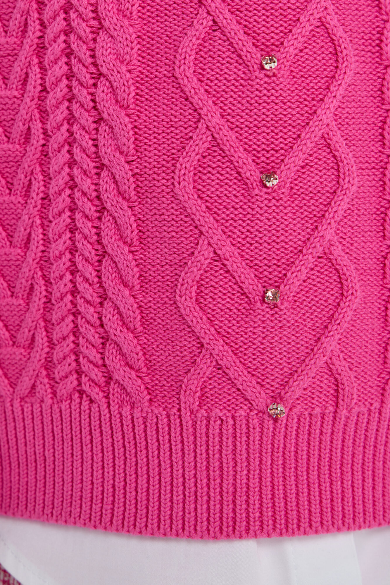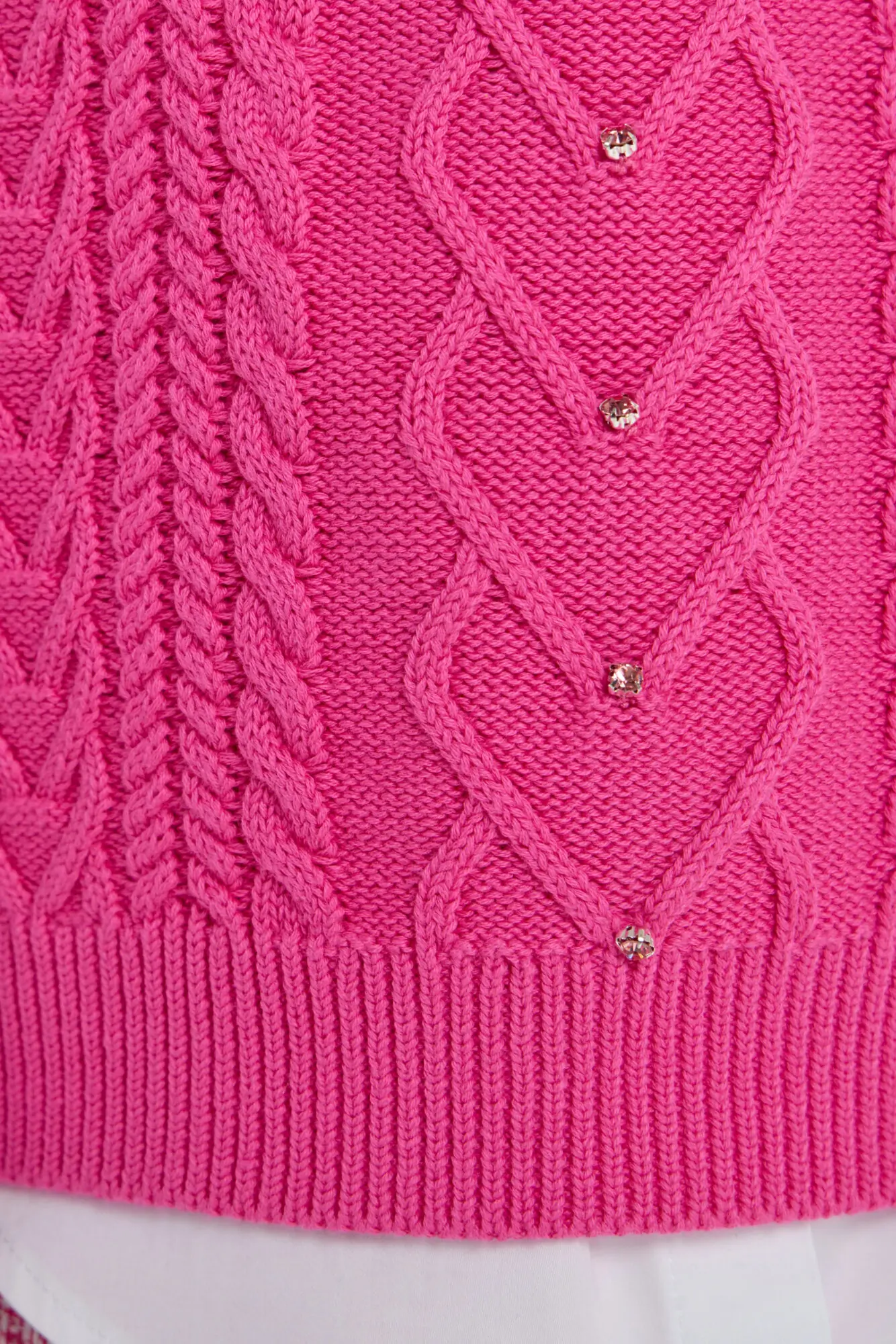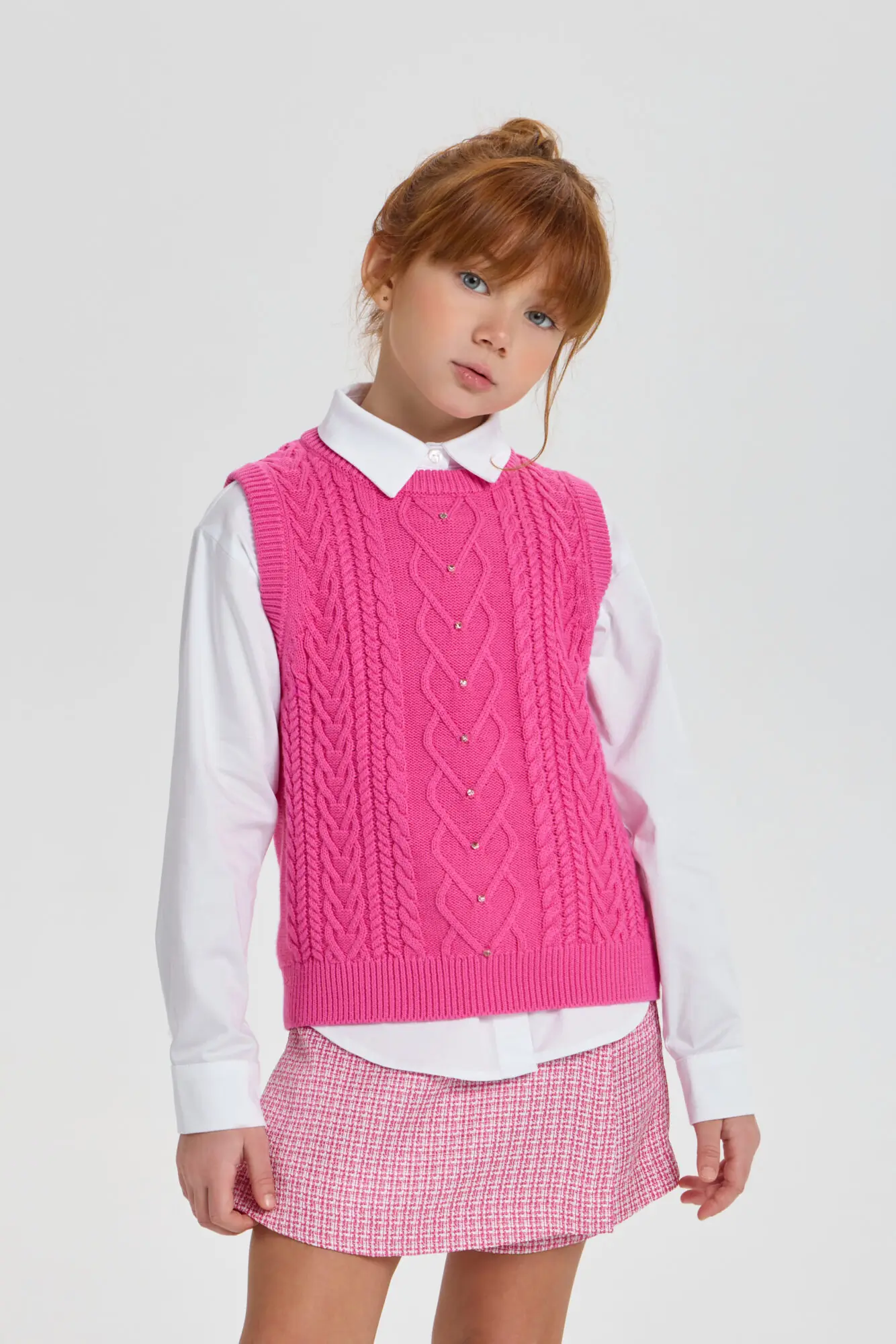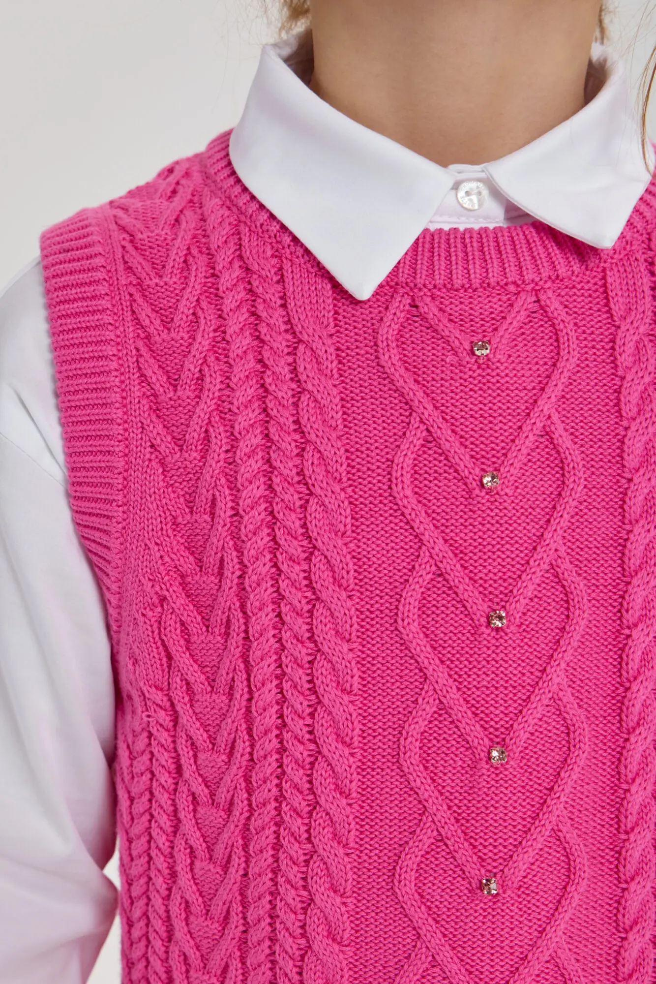 Вязаный жилет с актуальным рельефным узором из переплетенных петель станет прекрасным украшением гардероба девочки. Полностью хлопковый состав гарантирует мягкость и тепло. Это прекрасный выбор, сочетающий в ... себе привлекательный внешний вид и высокий уровень комфорта. Благодаря свободному фасону, жилет отлично сидит по фигуре. Актуальный ягодный оттенок и стильный декор из сверкающих страз придают этой модели особенную изюминку. Жилет идеально дополняет как строгие рубашки, так и нарядные блузки светлых тонов. Его можно носить как с джинсами, так и с классическими брюками.