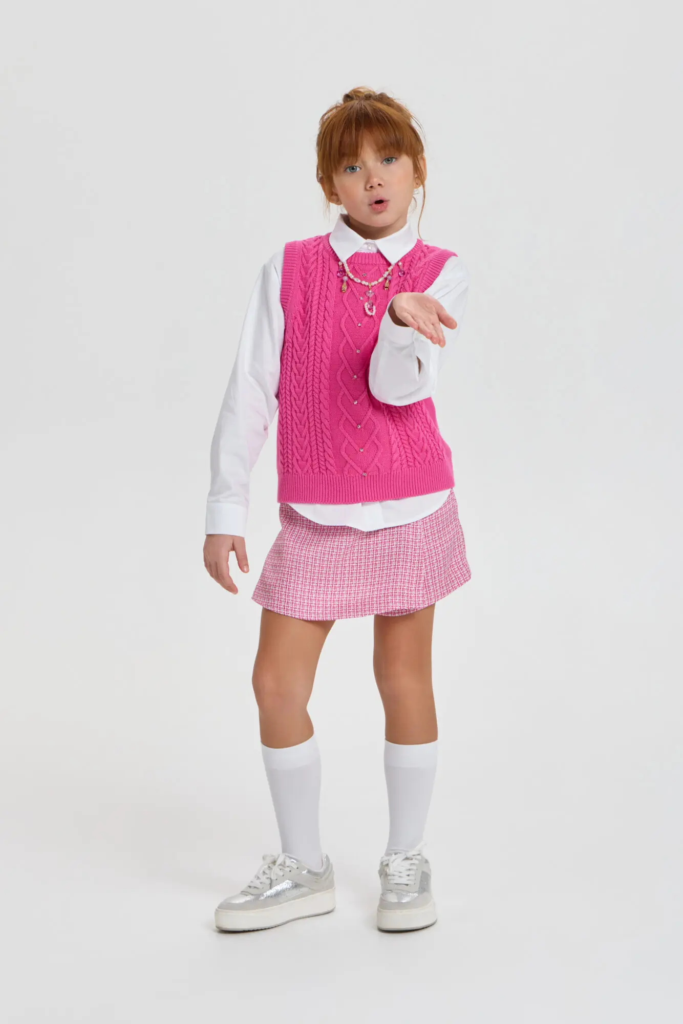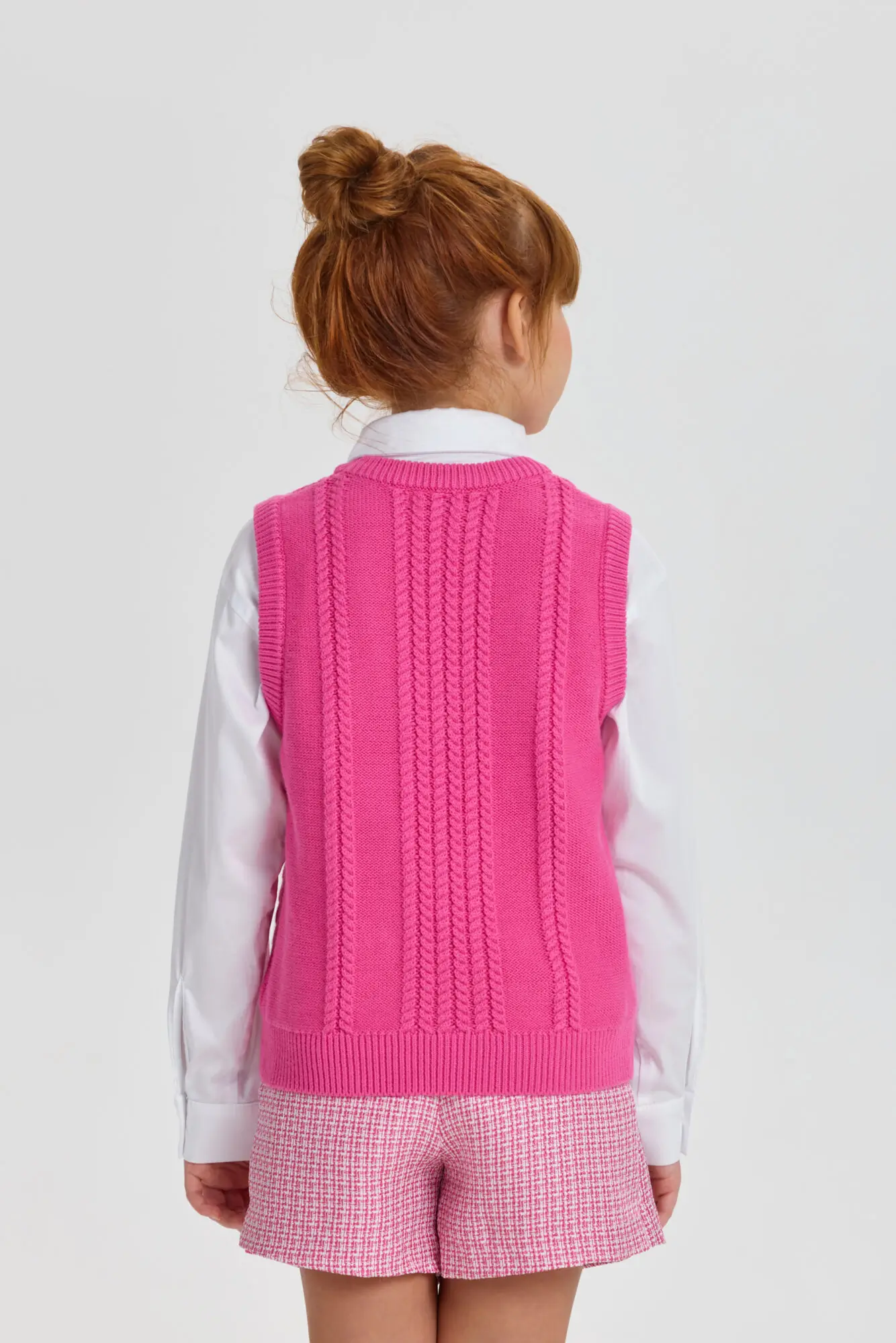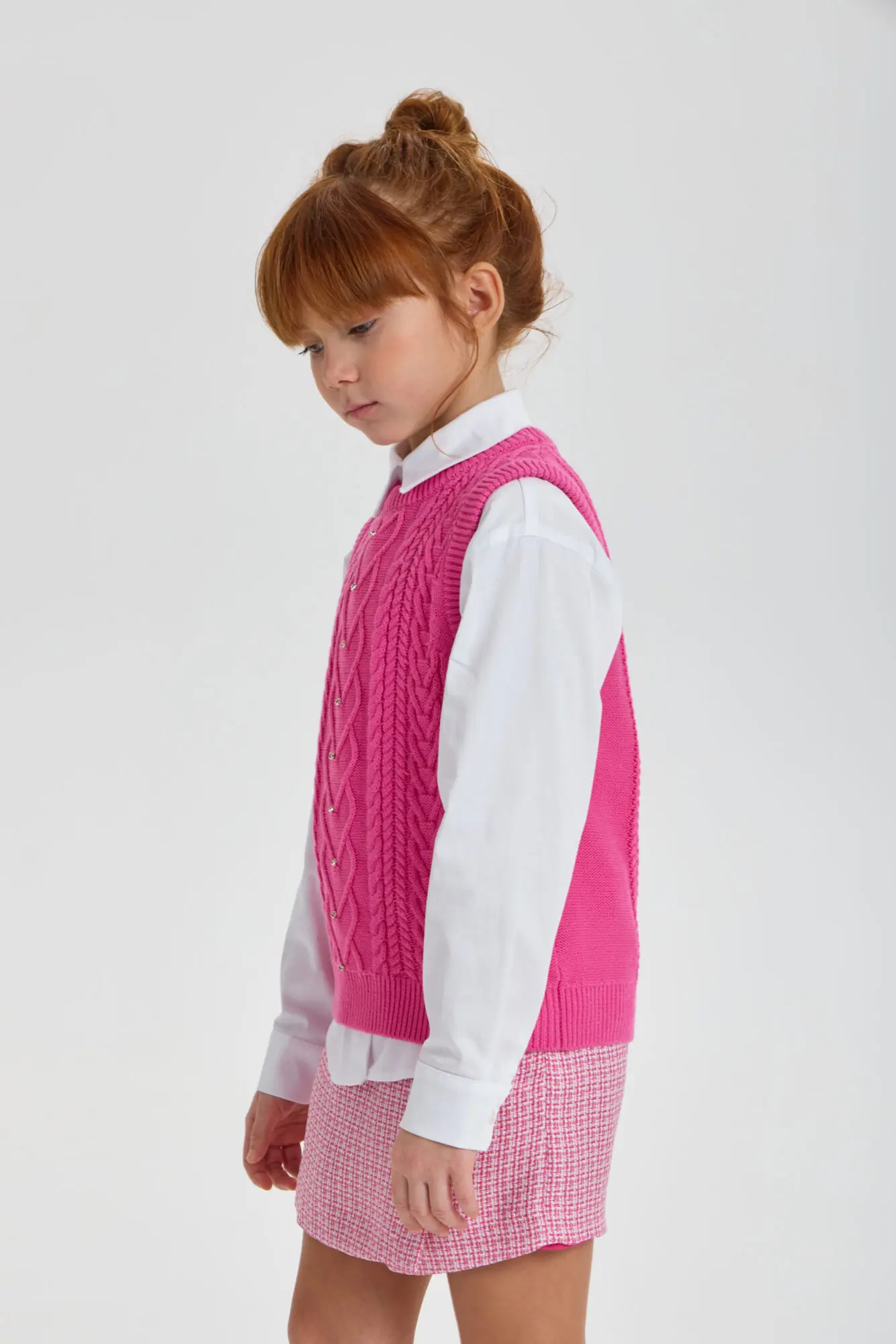 Вязаный жилет с актуальным рельефным узором из переплетенных петель станет прекрасным украшением гардероба девочки. Полностью хлопковый состав гарантирует мягкость и тепло. Это прекрасный выбор, сочетающий в ... себе привлекательный внешний вид и высокий уровень комфорта. Благодаря свободному фасону, жилет отлично сидит по фигуре. Актуальный ягодный оттенок и стильный декор из сверкающих страз придают этой модели особенную изюминку. Жилет идеально дополняет как строгие рубашки, так и нарядные блузки светлых тонов. Его можно носить как с джинсами, так и с классическими брюками.