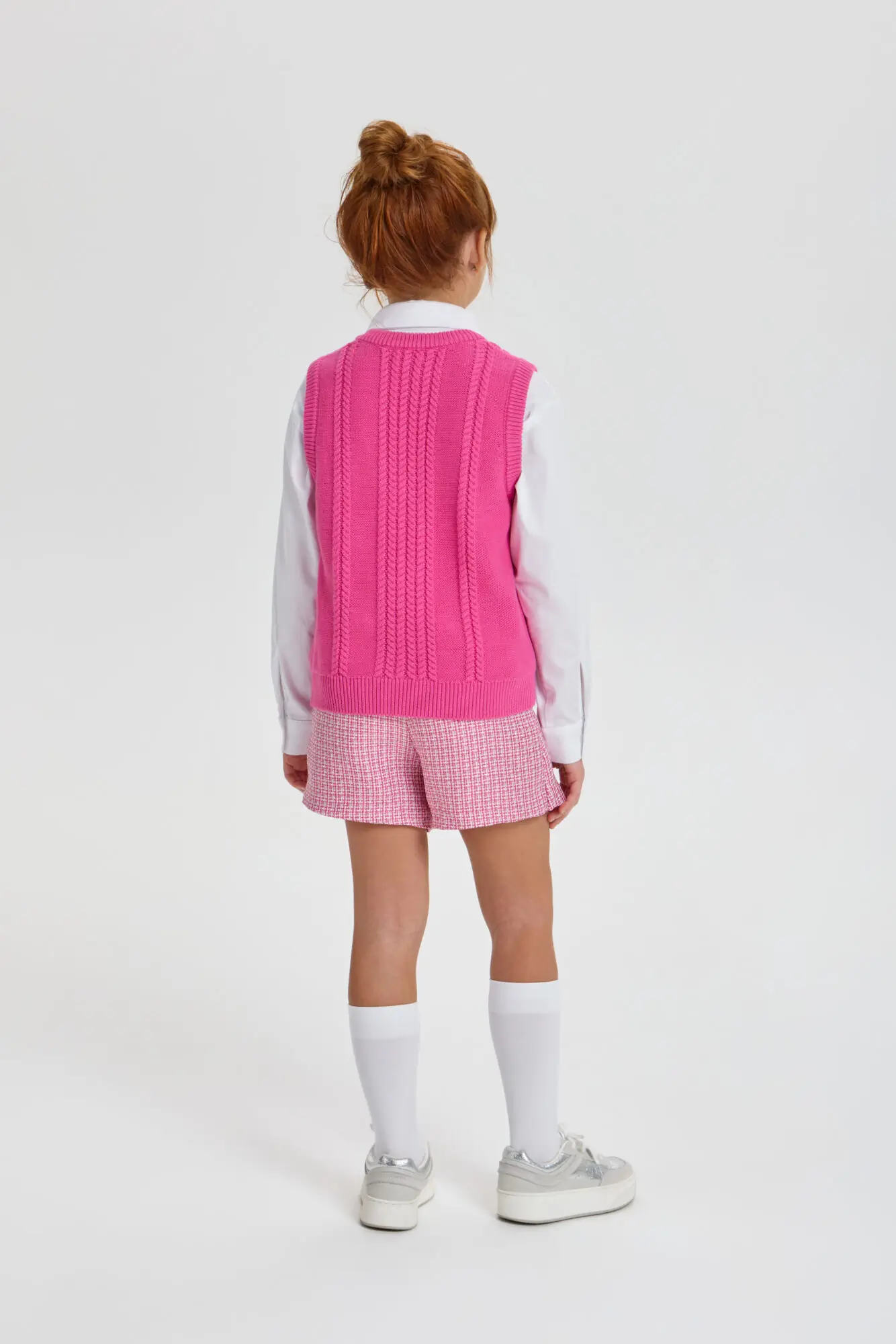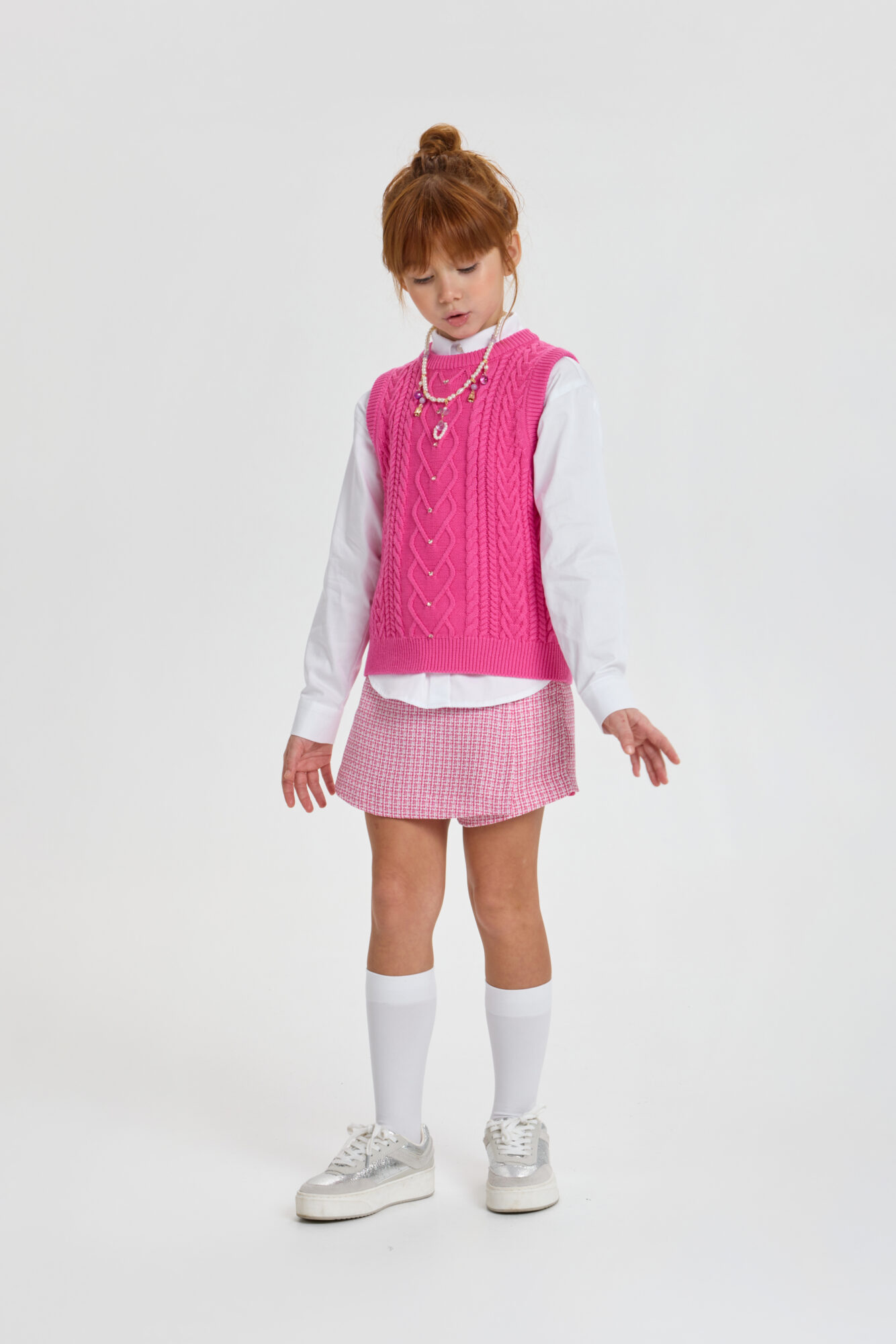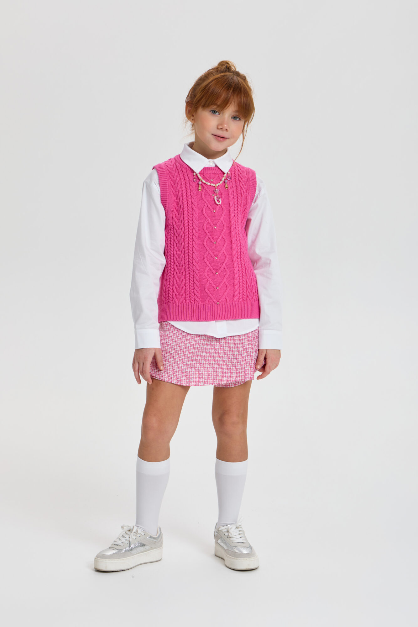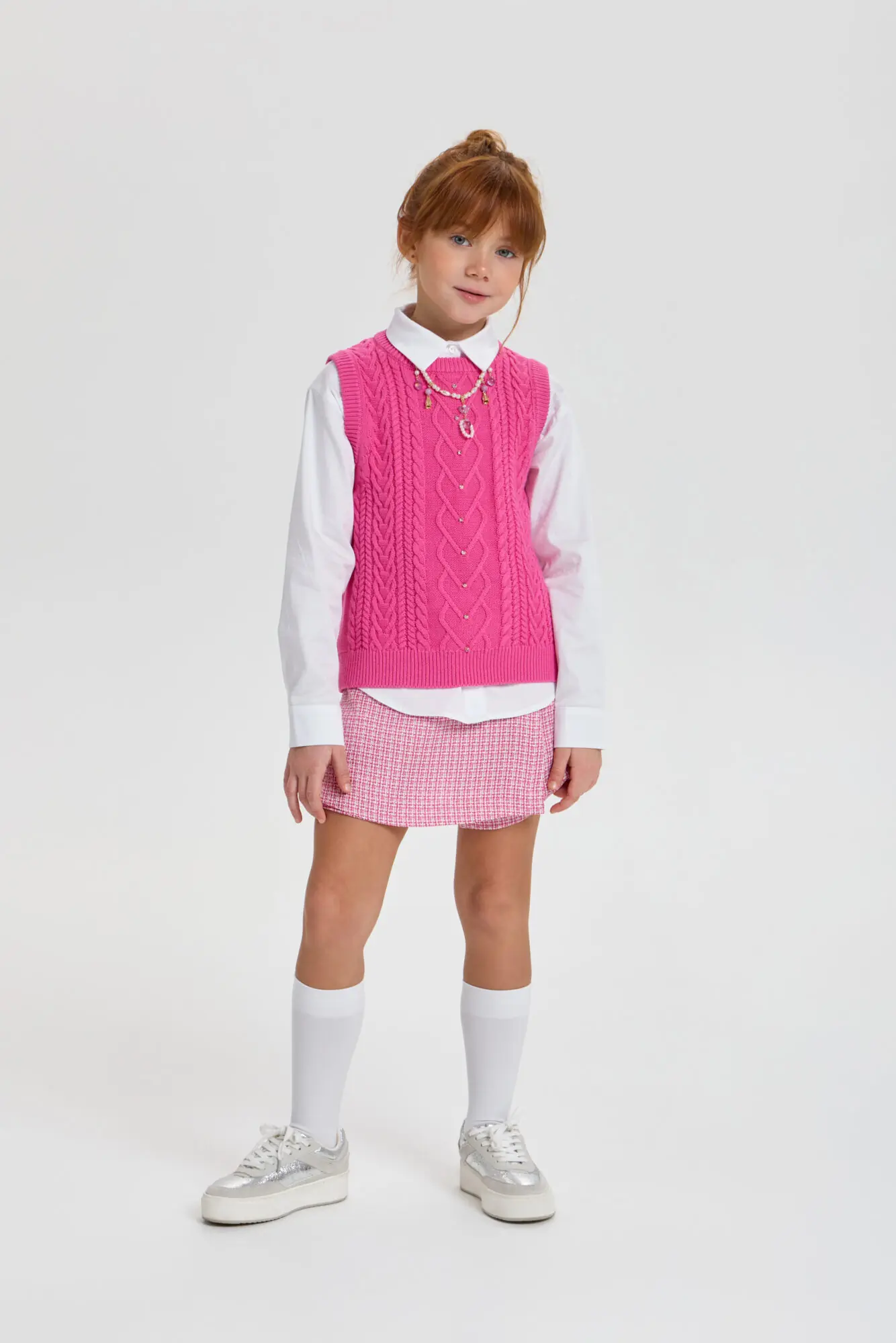 Вязаный жилет с актуальным рельефным узором из переплетенных петель станет прекрасным украшением гардероба девочки. Полностью хлопковый состав гарантирует мягкость и тепло. Это прекрасный выбор, сочетающий в ... себе привлекательный внешний вид и высокий уровень комфорта. Благодаря свободному фасону, жилет отлично сидит по фигуре. Актуальный ягодный оттенок и стильный декор из сверкающих страз придают этой модели особенную изюминку. Жилет идеально дополняет как строгие рубашки, так и нарядные блузки светлых тонов. Его можно носить как с джинсами, так и с классическими брюками.