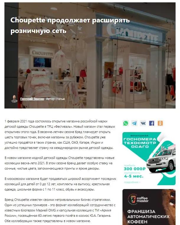 1 февраля 2021 года состоялось открытие магазина российской марки детской одежды Choupette в ТРЦ «Фестиваль». Новый магазин стал первым открытием этого года.